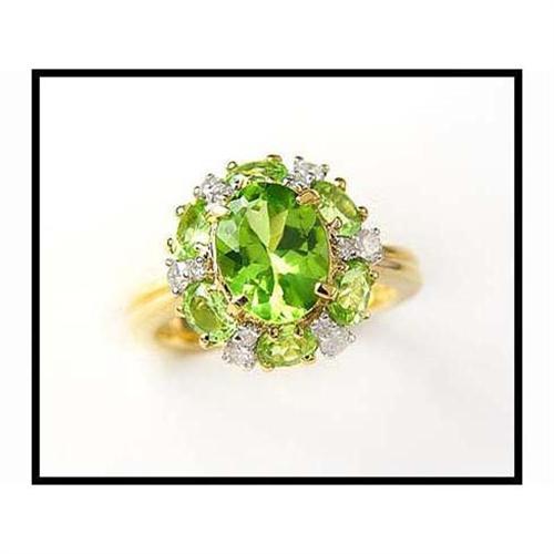 Exhibiting very high brilliance, the 2.50 carats of fine peridots are high in quality. 12 diamonds are prefect contrast as set in 18K gold. Weighs 7.09 grams measures 14mm (9/16") long. Size 6 1/2. Was priced at $795.