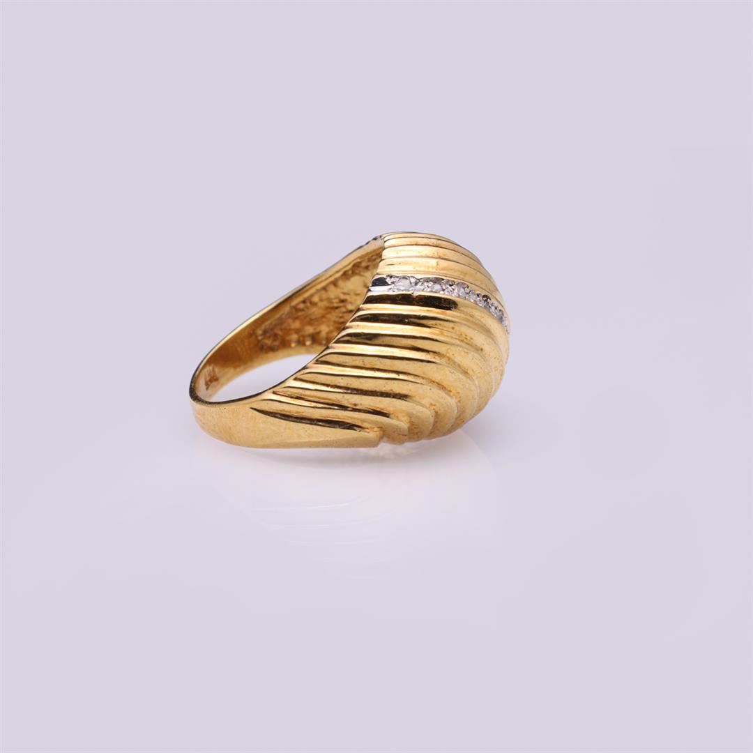 18k yellow gold ring in rounded domed form made up of joined graduated panels offset at an angle with a central rib containing numerous diamonds, circa 1960s, the interior of the ring marked 18k; gross weight 7.7 g, size 5.5