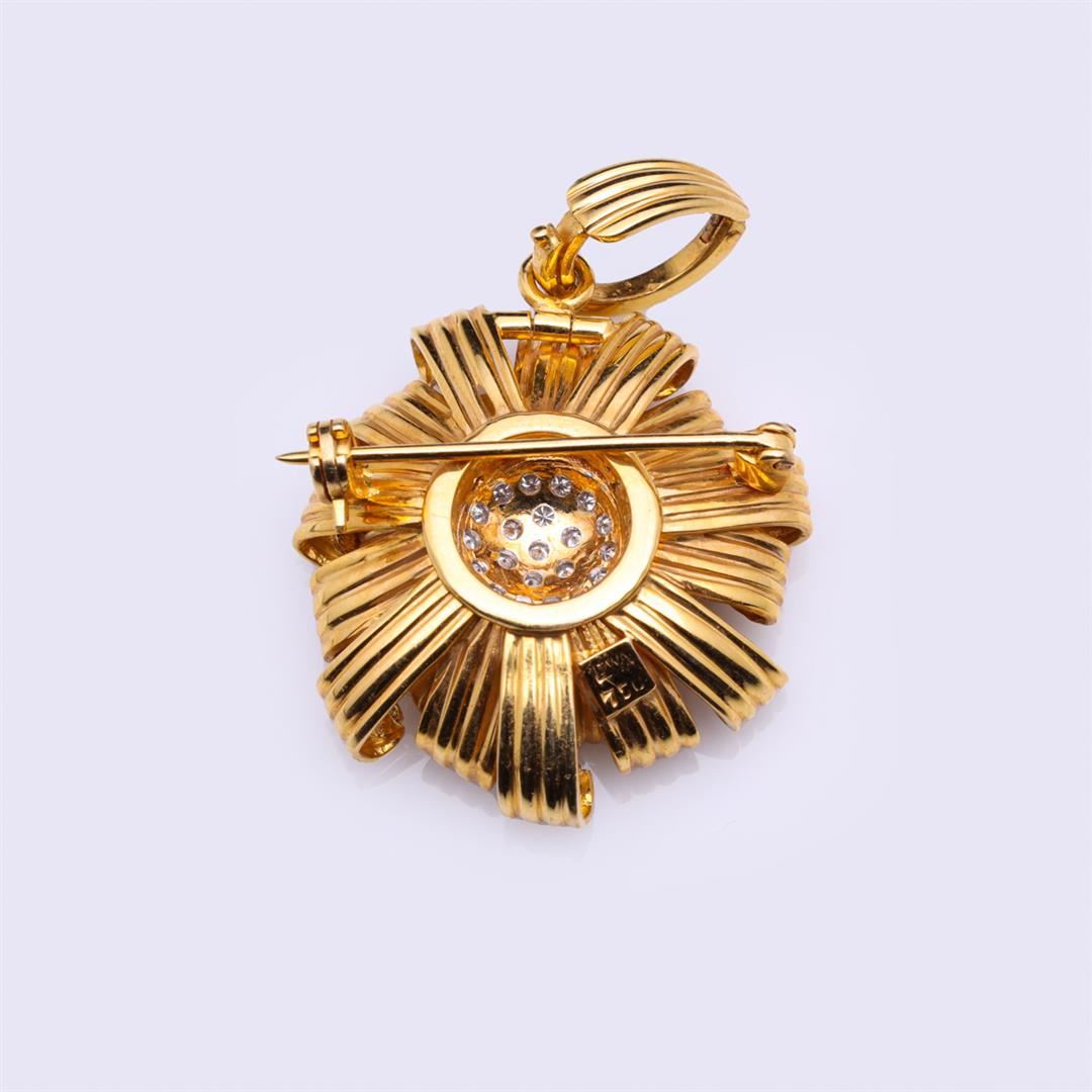 18K Yellow Gold & Diamond Pendant/Brooch containing twenty-eight round cut brilliant diamonds weighing approximately 0.35 cts. Total weight of ring is 13.4 gm. Estimated retail value $3,730.