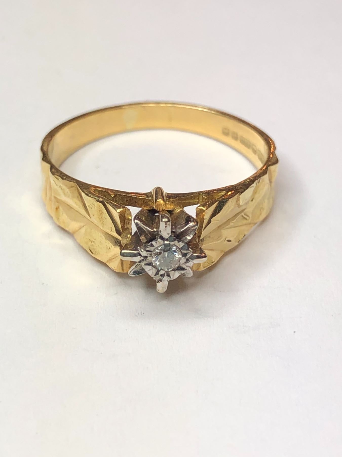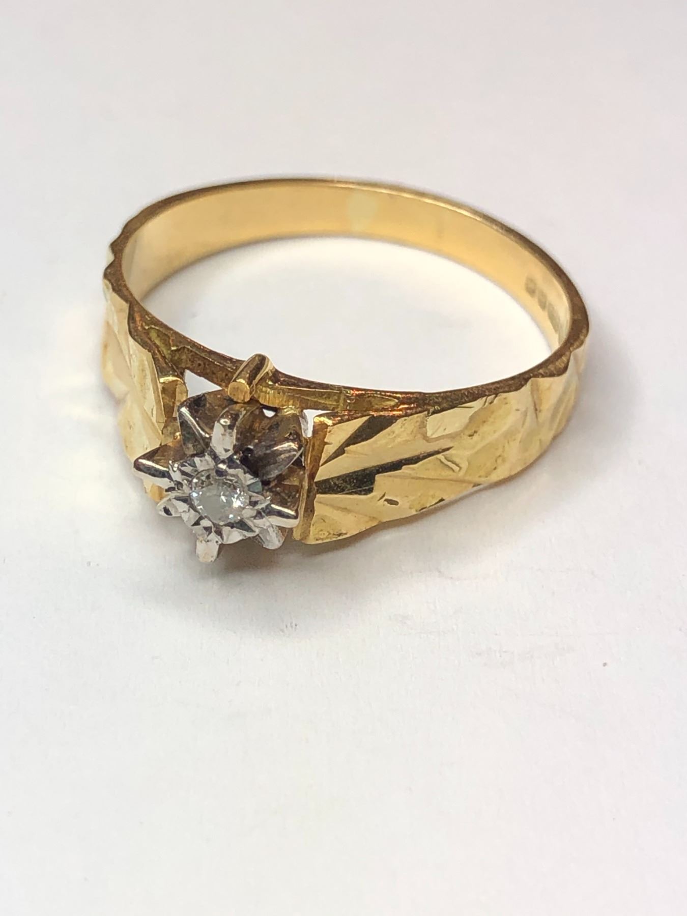 18K Yellow Gold Diamond Ring Weight: 4.1g 18K Yellow Gold Stone: .05ct I1, K Current Size: 8