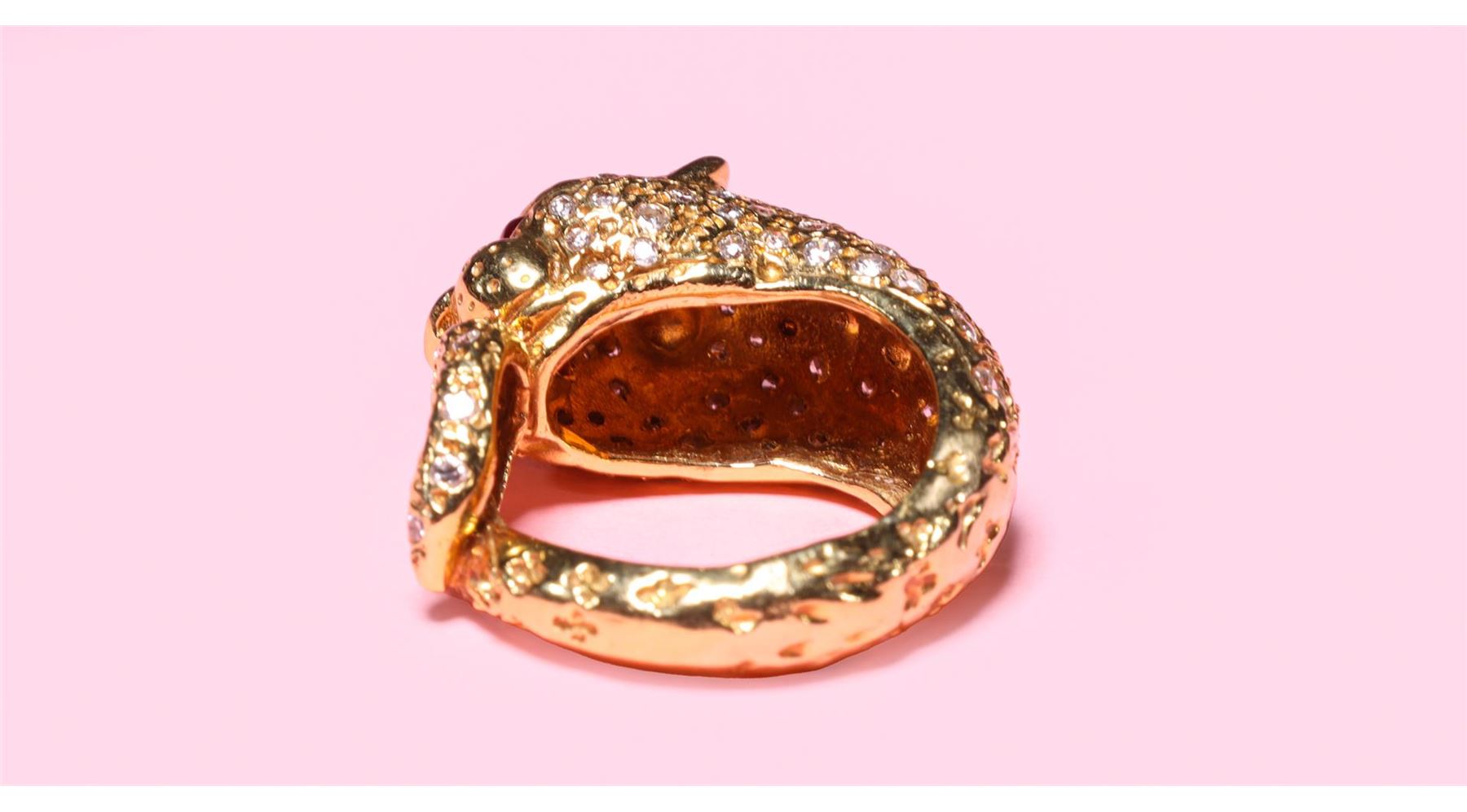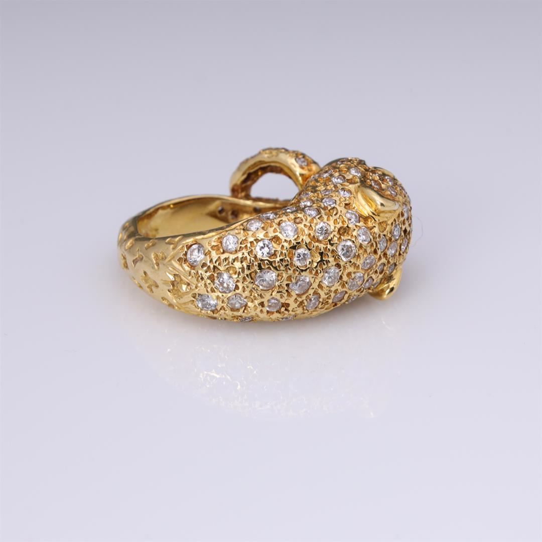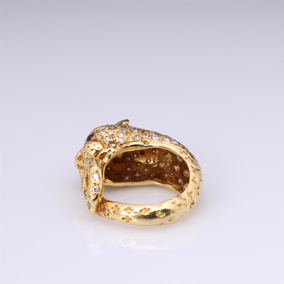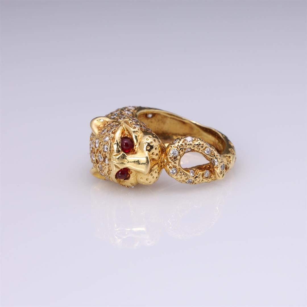 18k yellow gold panther form ring; the bodyand tip of panthers tail set with numerous white diamonds, each eye a ruby cabochon; gross weight 14.8 g, size 5 3/4