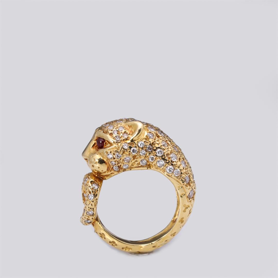 18k yellow gold panther form ring; the bodyand tip of panthers tail set with numerous white diamonds, each eye a ruby cabochon; gross weight 14.8 g, size 5 3/4