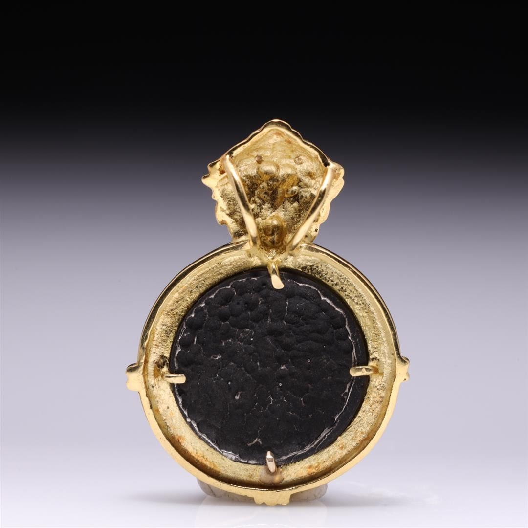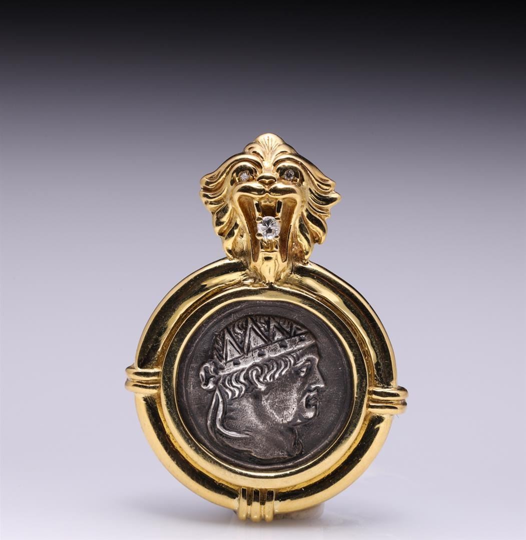 18k yellow gold pendant designed by R. L. Kay; the bale a finely detailed lion mask with diamond eyes and single claw set diamond in the lions open mouth; the center of the pendant set with silver medallion of Nero; gross weight 14.4 g, 1 1/2" x 1 1/8" (a