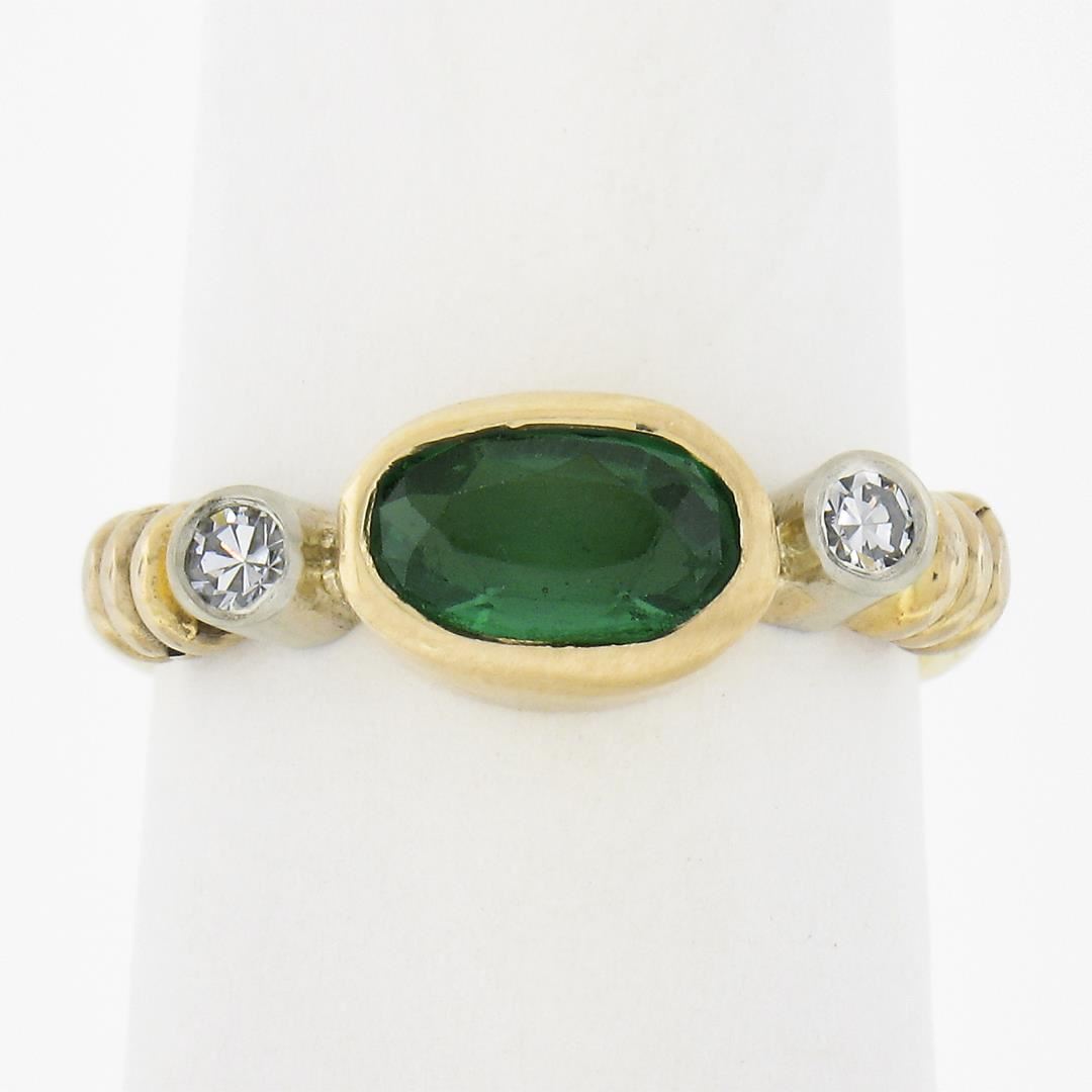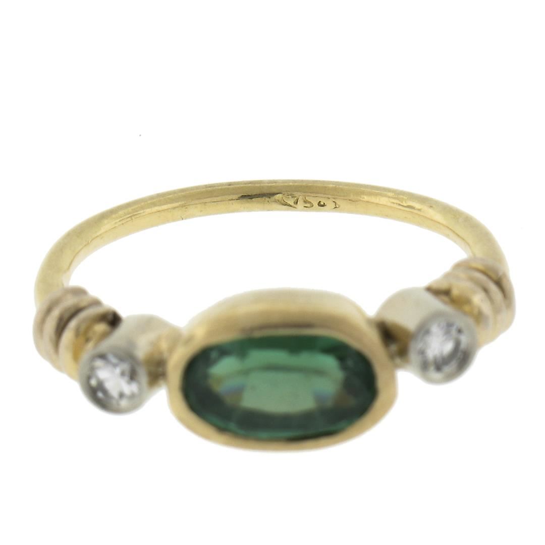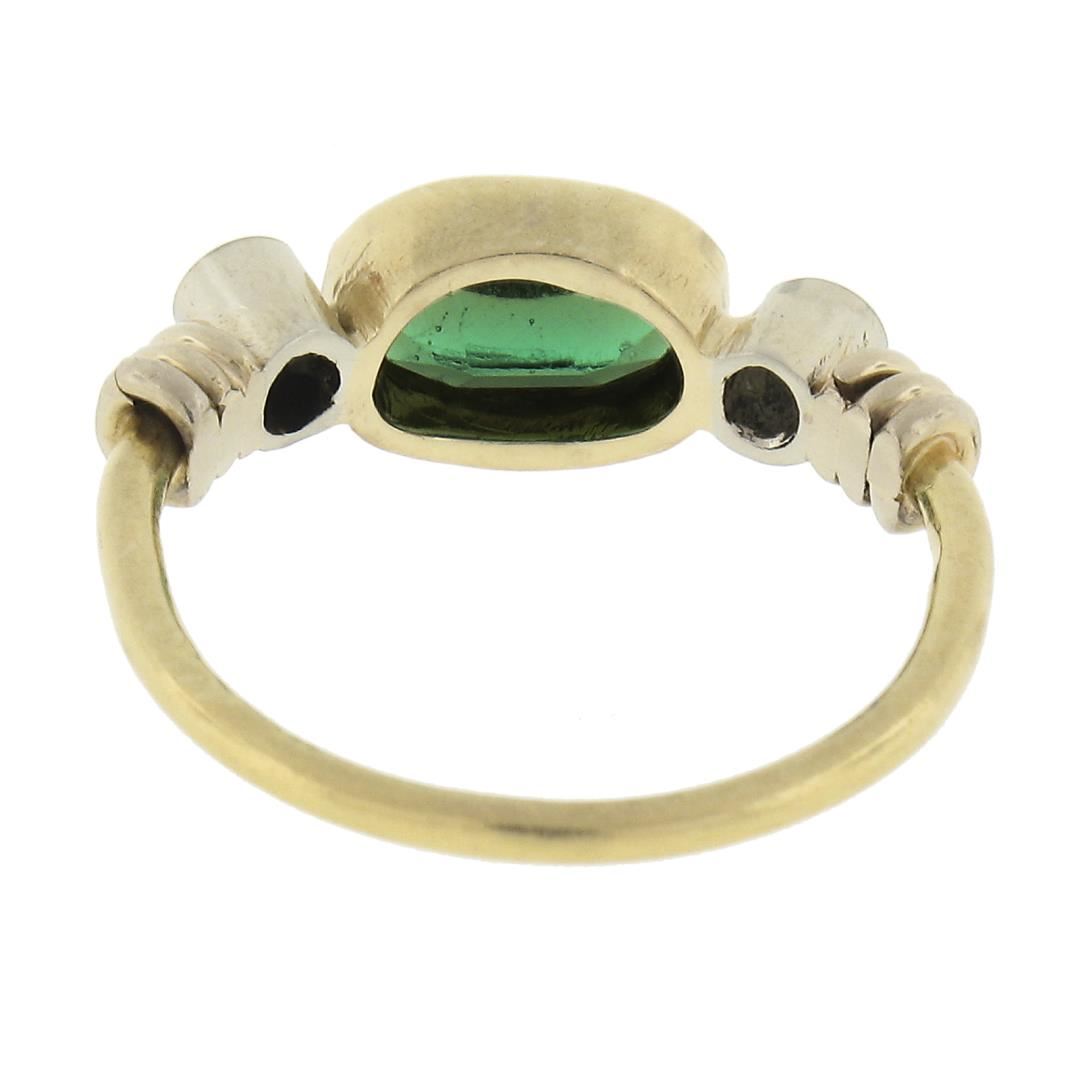 A solid 18k yellow gold band ring, with 1 oval cut natural tourmaline (6.8x4.3mm ), and 2 old single cut natural diamonds (F/G - VS1/VS2 ; 0.08ctw). The ring is size 5.5, weighs a total of 2.60 grams, and measures 6.2mm wide.