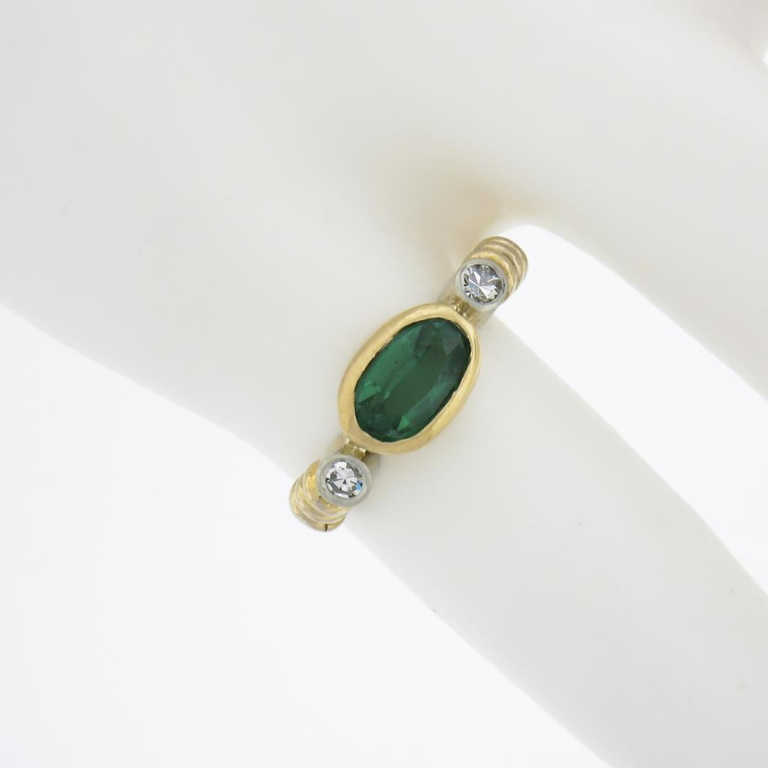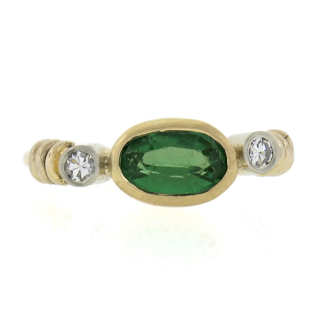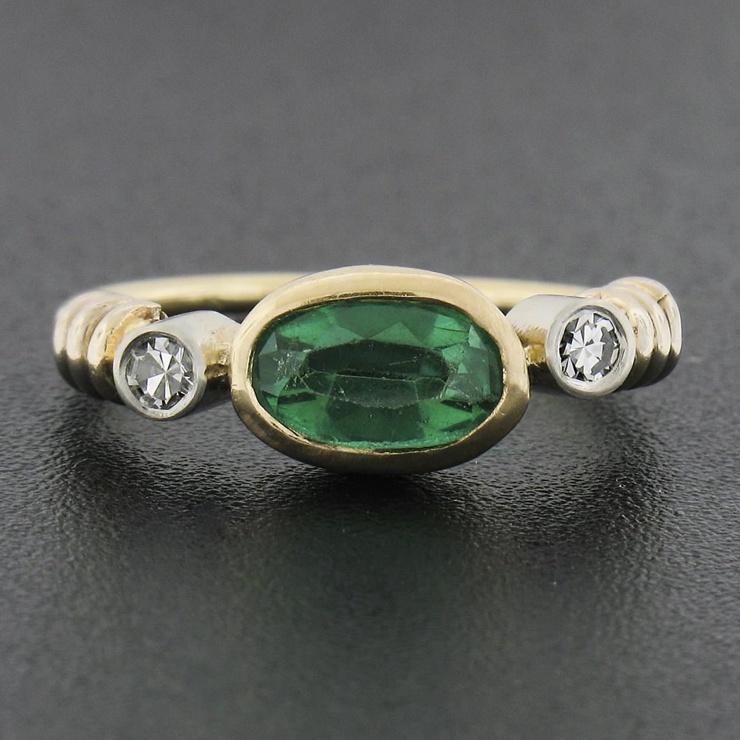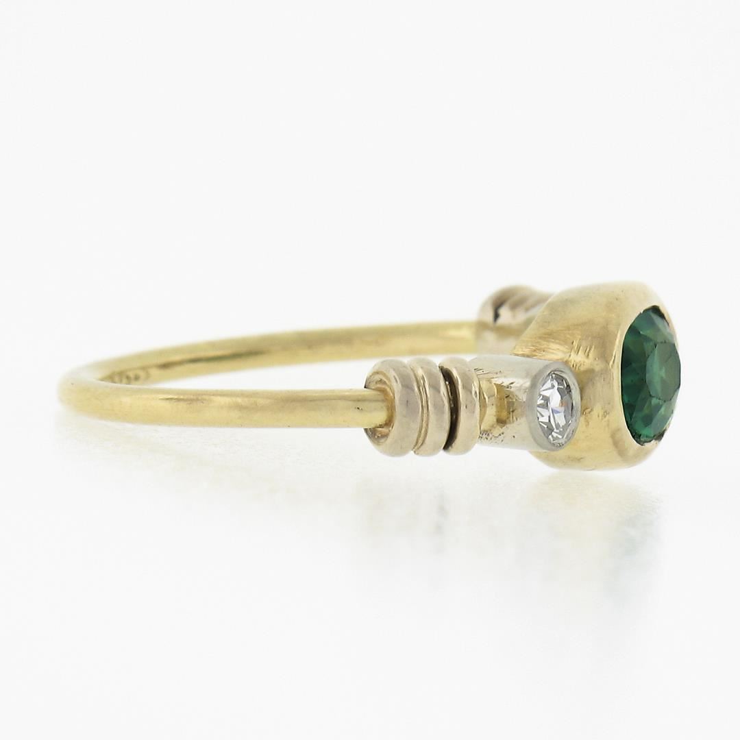 A solid 18k yellow gold band ring, with 1 oval cut natural tourmaline (6.8x4.3mm ), and 2 old single cut natural diamonds (F/G - VS1/VS2 ; 0.08ctw). The ring is size 5.5, weighs a total of 2.60 grams, and measures 6.2mm wide.