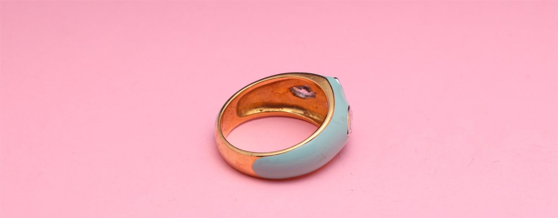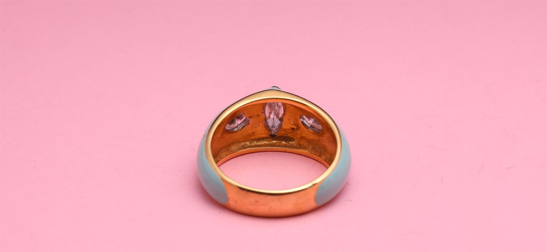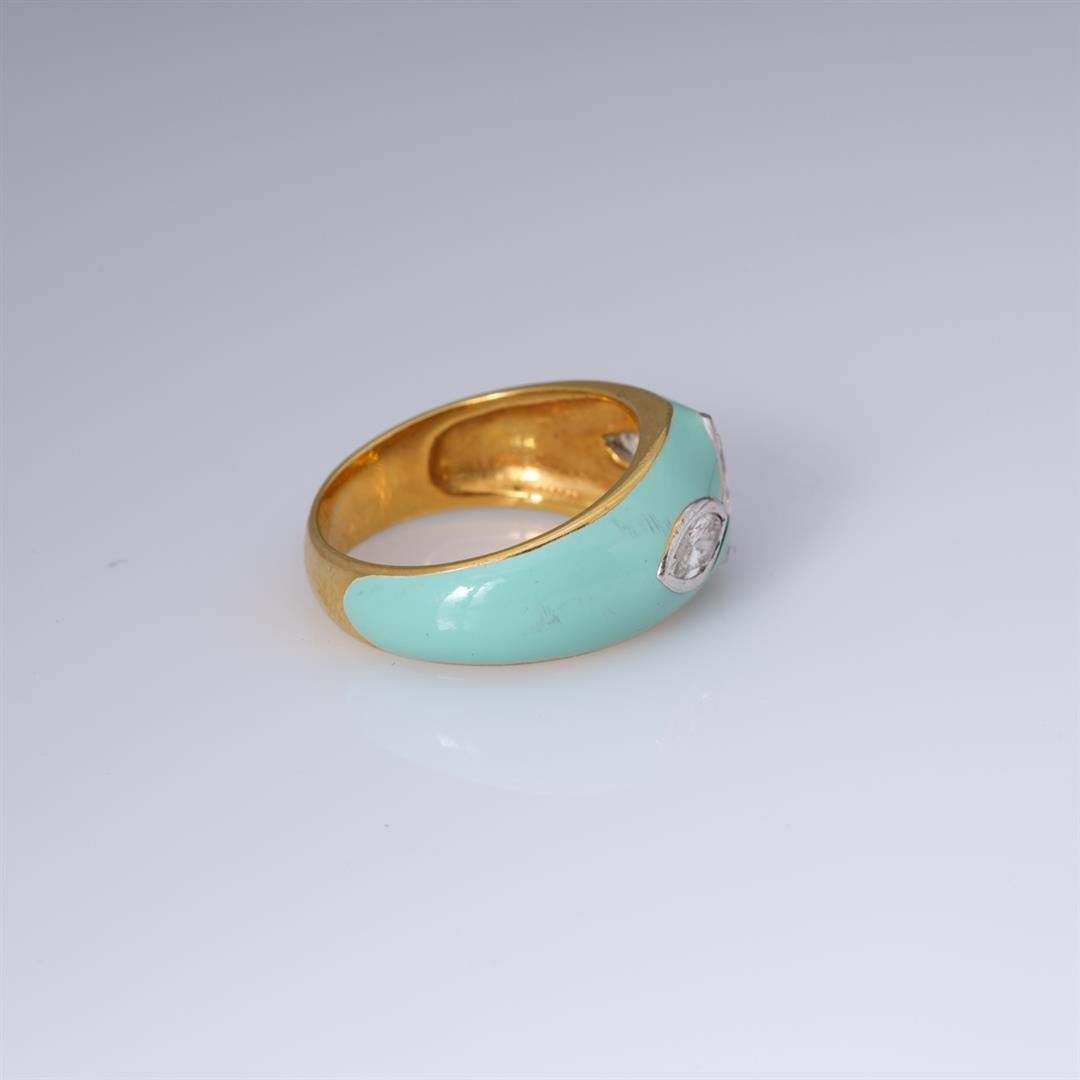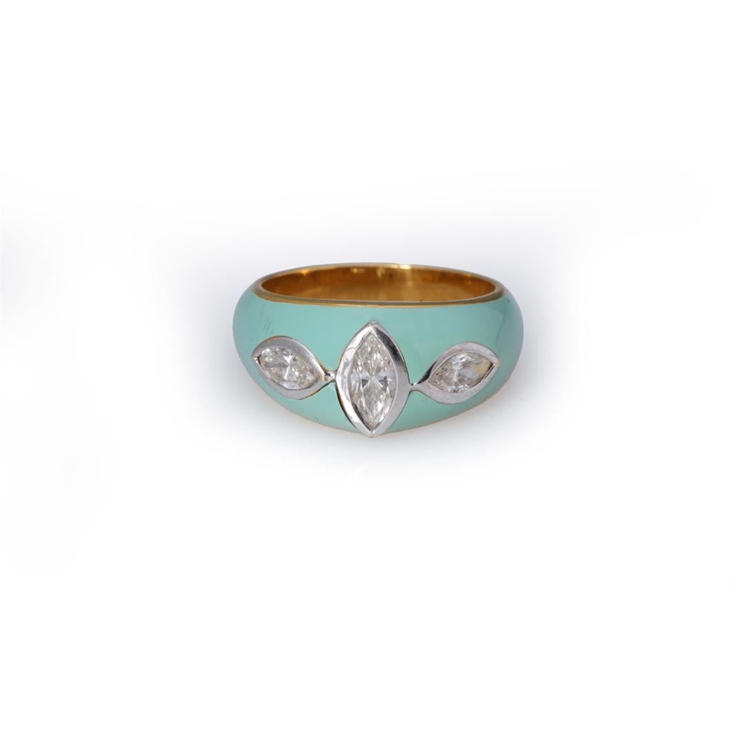 Three marquis cut diamonds, each bezel set and mounted in an 18k yellow gold ring with turquoise enamel, marked 18k to interior; gross weight 7.5 g, size 6 3/4