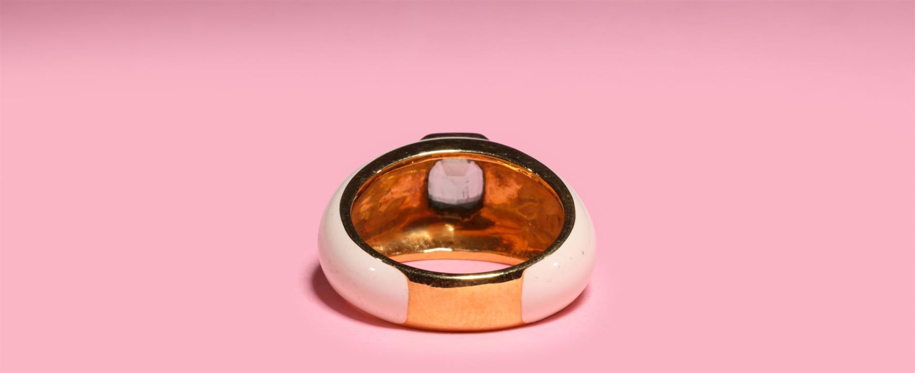 A center emerald bezel set in an 18k yellow gold ring with white enameling to shoulders and shank, marked 18k to interior band; overall good condition; gross weight 11.2 g, size 7
