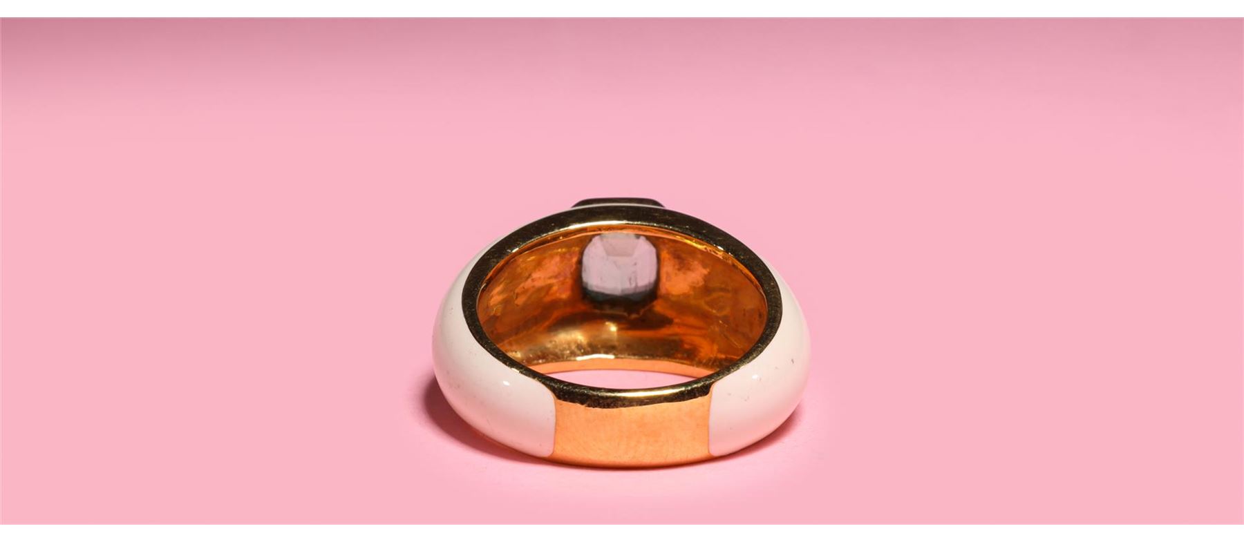 A center emerald bezel set in an 18k yellow gold ring with white enameling to shoulders and shank, marked 18k to interior band; overall good condition; gross weight 11.2 g, size 7