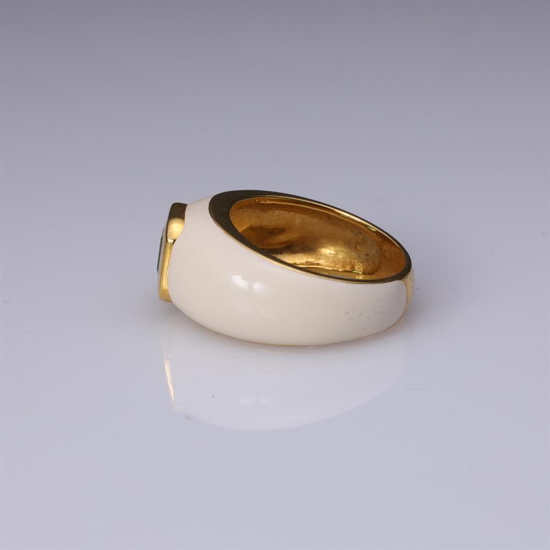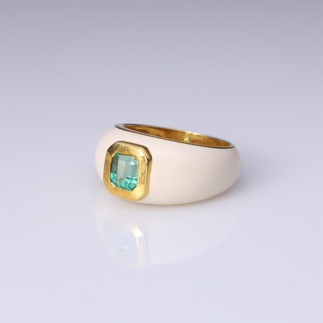18K Yellow Gold Enamel & Emerald Ring containing one emerald cut emerald 5.5mm x 4.8mm weighing approximately 1.20cts. Total weight of ring is 11.5gm. Estimated retail value $3,750.