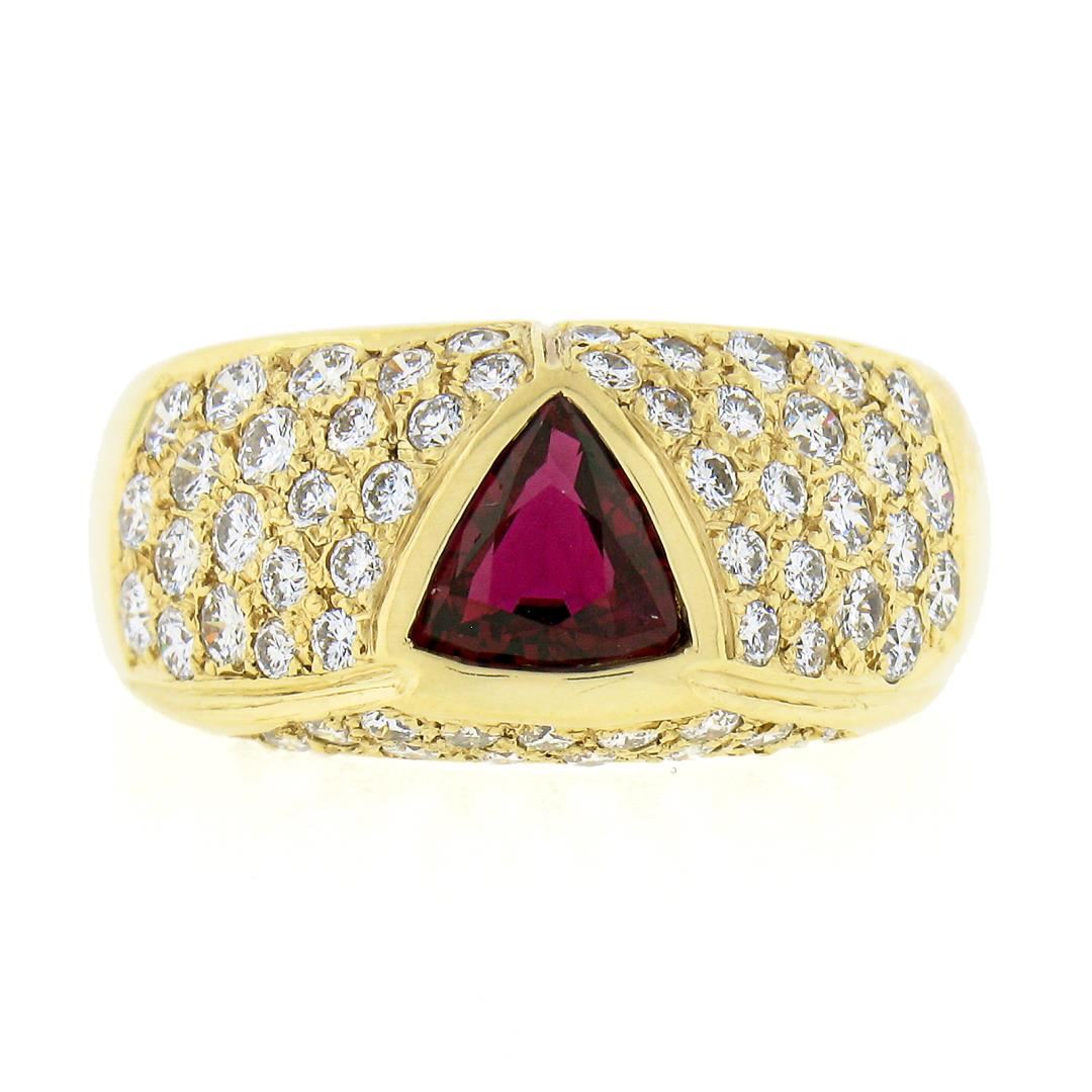 A solid 18k yellow gold ring, with 1 GIA graded triangular cut natural ruby (0.78ct), and 57 round cut natural diamonds (G/H - VS1/VS2 ; 0.85ctw). The ring is size 7.0, weighs a total of 5.99 grams, and measures 9.80mm wide. Comes with all original relevant certifications.