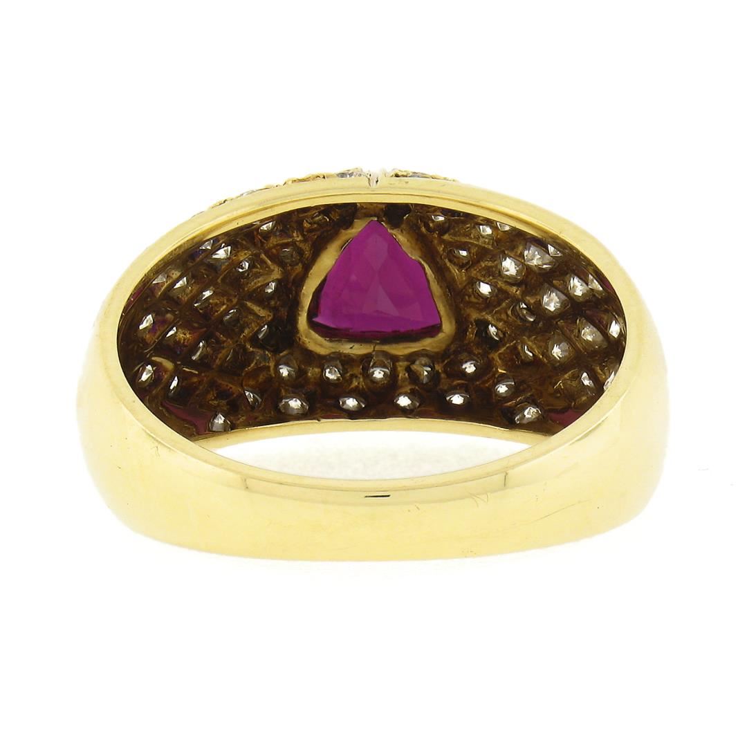 A solid 18k yellow gold ring, with 1 GIA graded triangular cut natural ruby (0.78ct), and 57 round cut natural diamonds (G/H - VS1/VS2 ; 0.85ctw). The ring is size 7.0, weighs a total of 5.99 grams, and measures 9.80mm wide. Comes with all original relevant certifications.