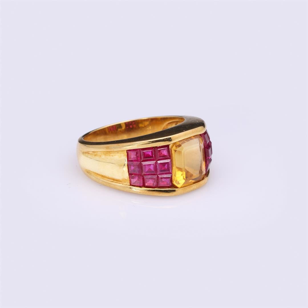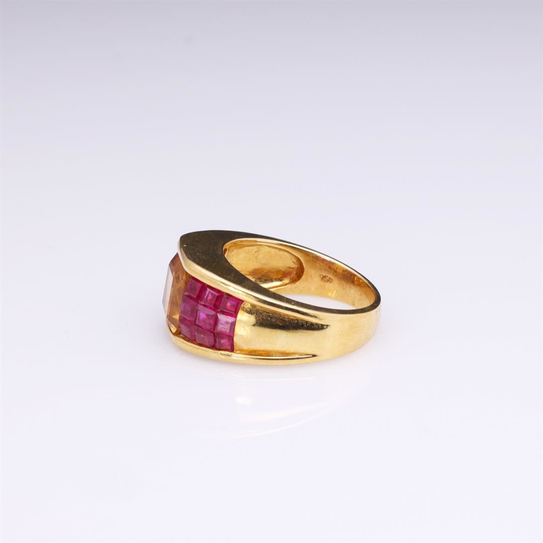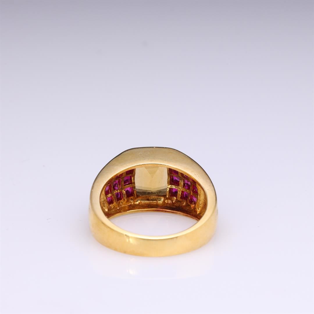 18K Yellow Gold Golden Topaz & Invisible Set Ruby Ring containing one emerald cut topaz 8.8mm x 7.9mm weighing approximately 2.50 cts. Eighteen square cut rubies weighing estimated 0.30 cts. Total weight of ring is 11.1 gm. Estimated retail value $4,200.