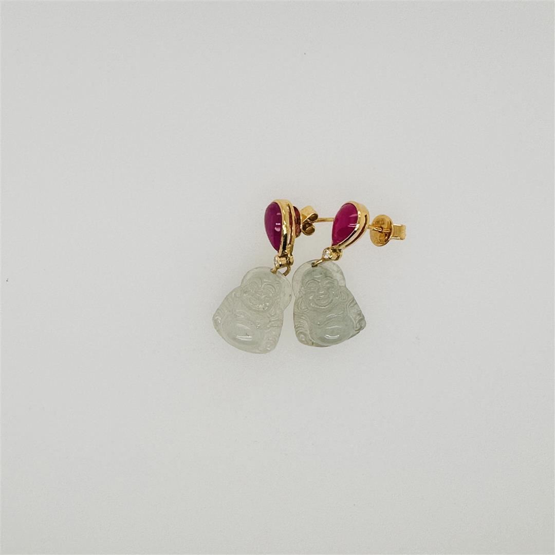 Pair of 18k yellow gold earrings by Carlo Rici; each earring with ice jadeite carving of seated Buddha with single diamond and teardrop ruby cabochon, the earring backs marked RICI CR750; gross weight 8.1g L 1 1/4 inches (approx.)