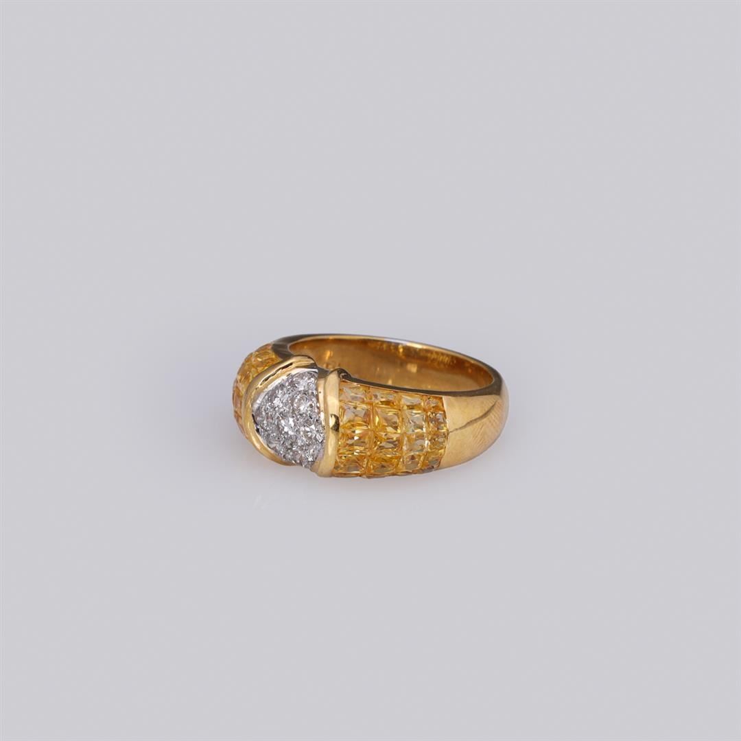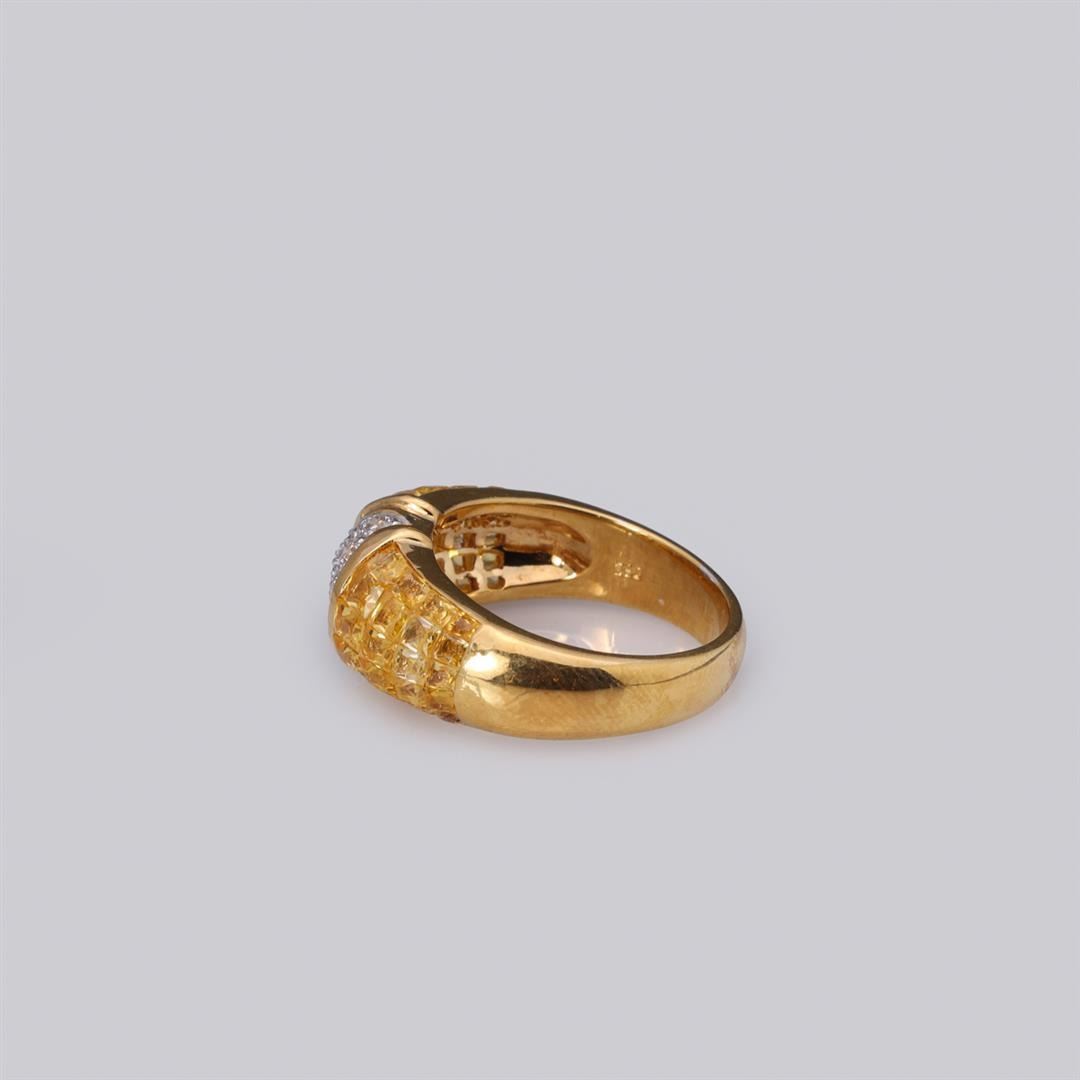 18k yellow gold invisible set sapphire and diamond cluster ring; the center with 9 white diamonds and each shoulder with four rows of invisible set yellow sapphires; marked 750 to interior band; gross weight 10.1 g, size 7 1/2