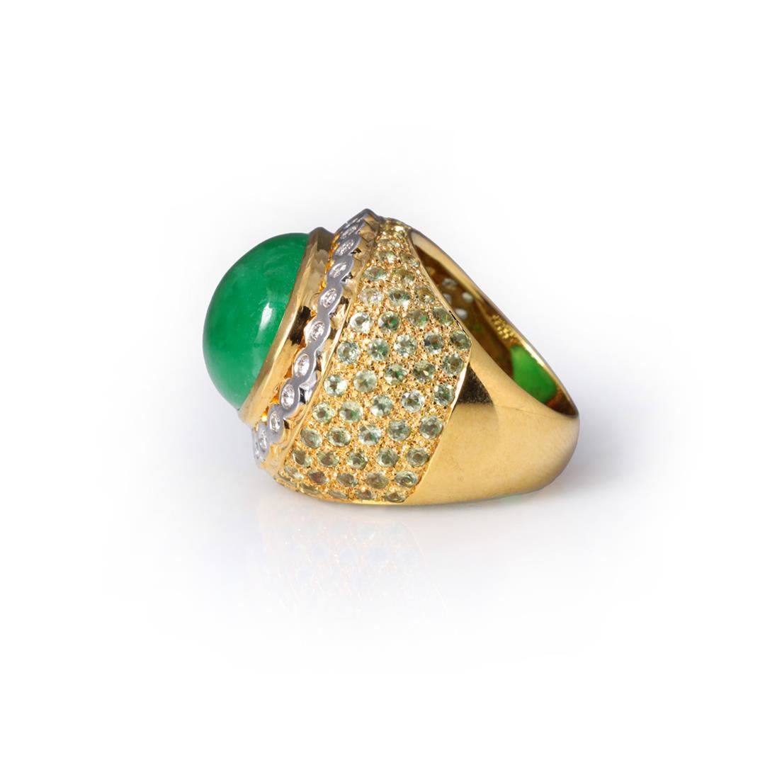 18K Yellow Gold Jadeite Peridot & Diamond Ring containing one oval cabochon 18mm x 14.3mm jadeite. Twenty-four round brilliant cut diamonds weighing approximately 0.60 cts. One hundred four peridot weighing 2.10 cts. Total weight of ring is 21 gm. Estimat