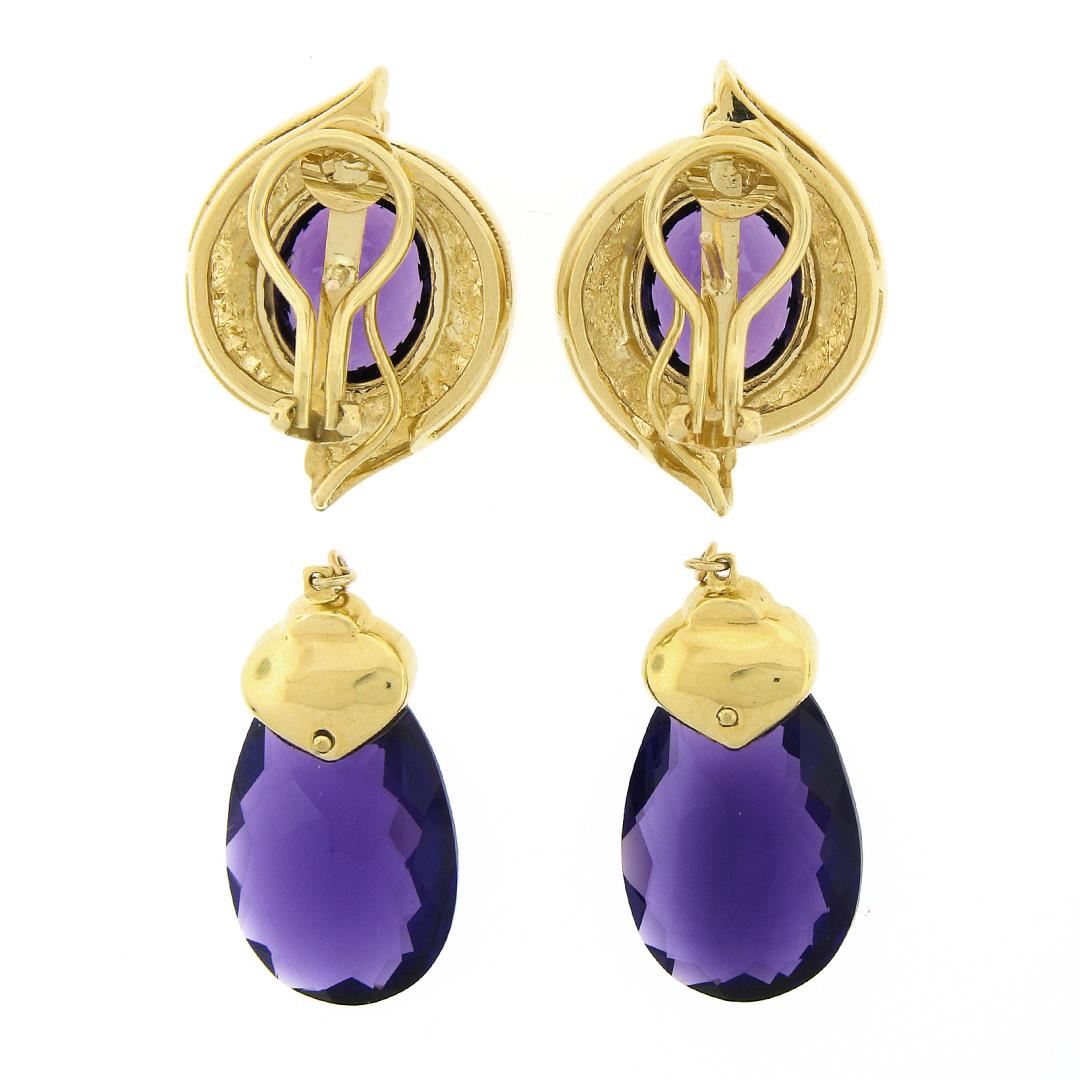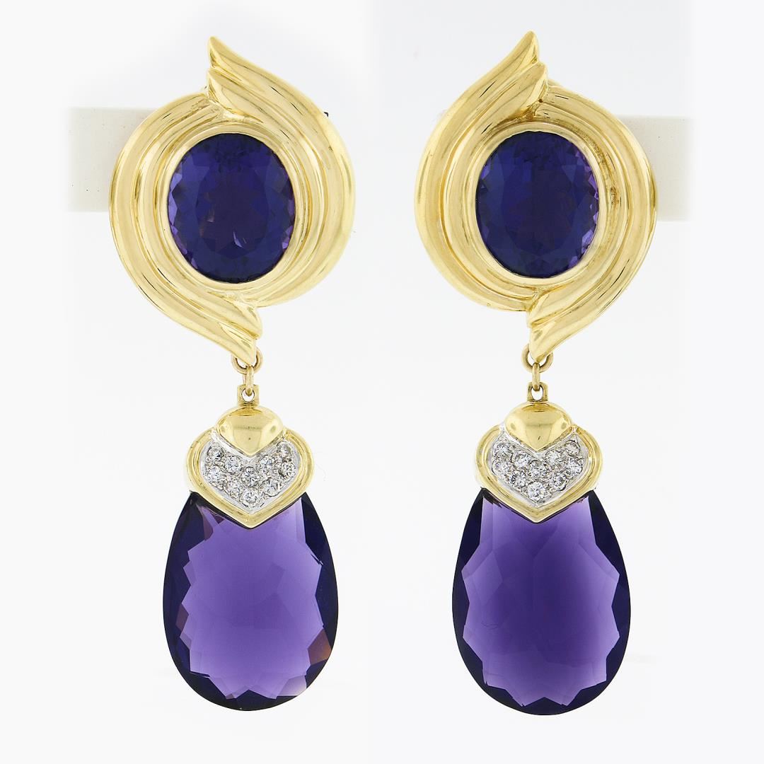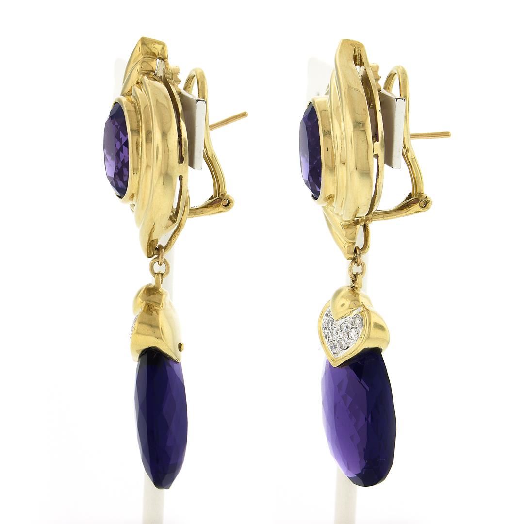 A solid 18k yellow gold enhancer day night dangle earrings, with 2 oval cut natural amethysts (11x13mm / 11.0ctw), and 2 pear cut natural amethysts (14.0ctw), and 20 round brilliant cut natural diamonds (F/G - VS1/VS2 ; 0.25ctw). The earrings measure approximately 60.60x21.80mm and weigh a total of 33.24 grams.