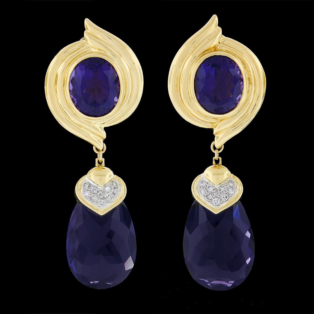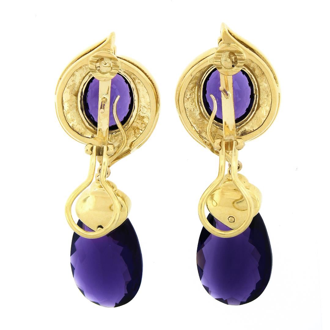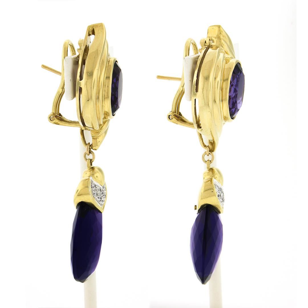 A solid 18k yellow gold enhancer day night dangle earrings, with 2 oval cut natural amethysts (11x13mm / 11.0ctw), and 2 pear cut natural amethysts (14.0ctw), and 20 round brilliant cut natural diamonds (F/G - VS1/VS2 ; 0.25ctw). The earrings measure approximately 60.60x21.80mm and weigh a total of 33.24 grams.