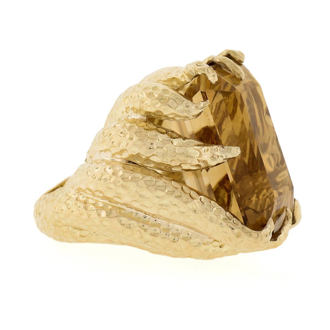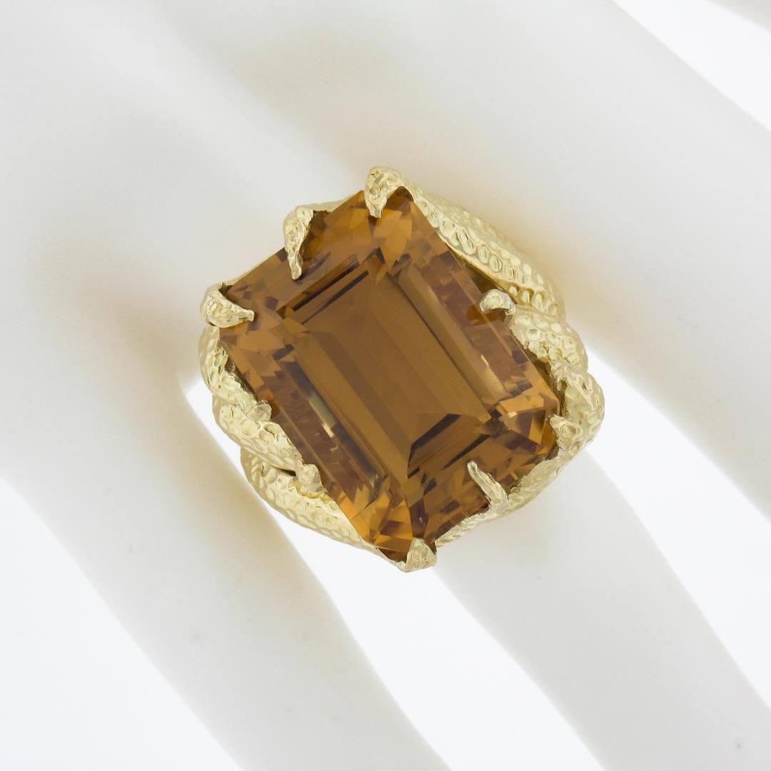 A solid 18k yellow gold ring, with 1 large emerald cut natural citrine ( 28 to 30ct). The ring is size 5.5, weighs a total of 30.91 grams, and measures 25.1mm wide.