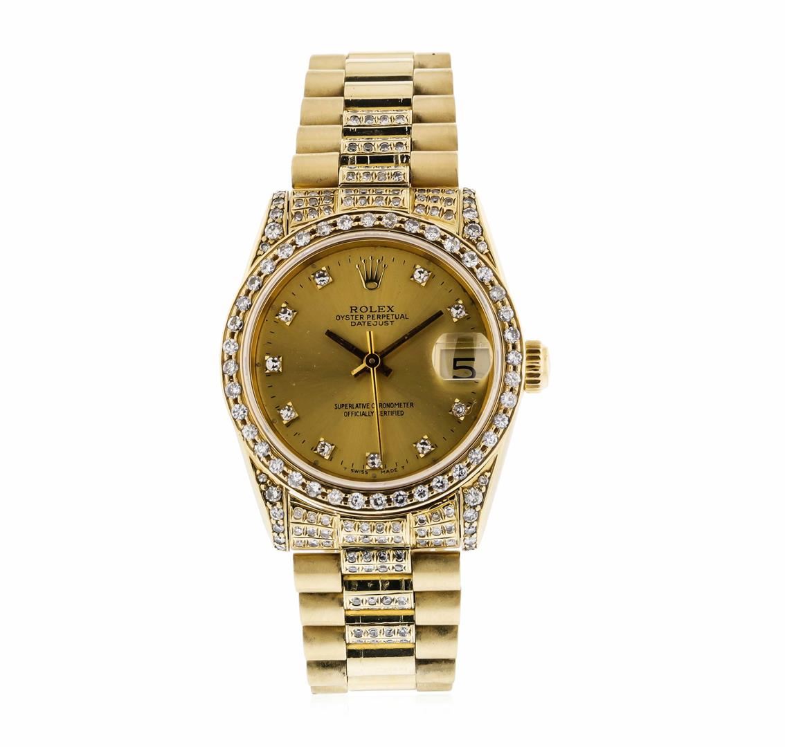 One 18K Yellow Gold Mid-Size Rolex Datejust Wristwatch w/ Diamonds, Serviced & Electronically Tested, 18K Yellow Gold Case: 30mm with Custom Diamond Lugs, 18K Yellow Gold Crown, Custom Bezel: 18K Yellow Gold Diamond Bezel, Diamond Count: 40 Diamonds. Crystal: Synthetic Sapphire Cyclops Lens. Movement: Automatic Winding Movement. Custom Dial: Champagne with Diamond Markers. Diamond Count: 10 Diamonds on Dial, Color: G to H, VS. Date Window: 3 O'Clock Position Date Display with Quickset, Model: 68278 Datejust Condition: Excellent working order and Good condition. Bracelet: 18K Yellow Gold President Bracelet with custom diamond end pieces, 18K Yellow Gold Hidden Clasp fitting a wrist up to 6.75 inches, with Rolex Logo.