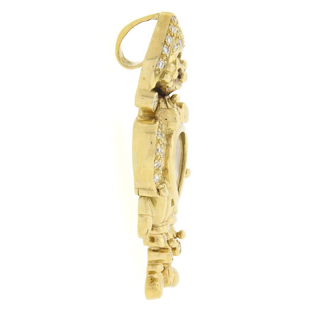 A solid 18k yellow gold clown pendant, with 42 round cut natural diamonds (F/G - VS2-SI2 ; 0.65tw). The pendant weighs a total of 21.74 grams, measures 46.7x21.5mm including the bail, and the inside of the bail measures 7.6x5.4mm.