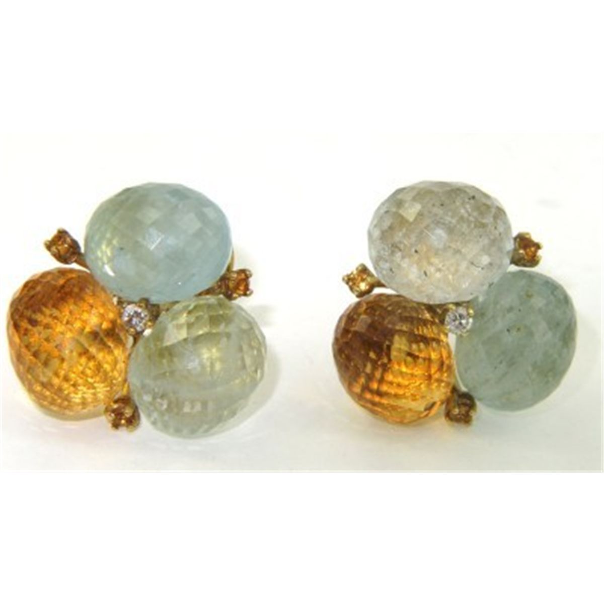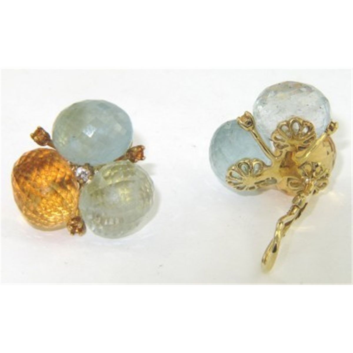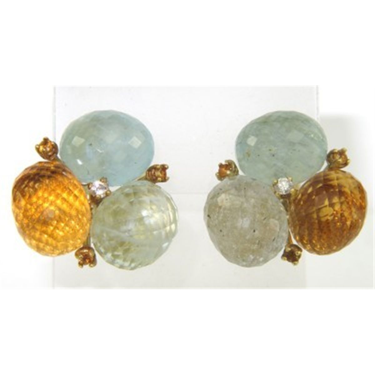 18K Yellow Gold Multi-colored Stones Diamond Earrings.18K Yellow Gold Multi-Colored Stone ( Citrine, Aquamarine & Prasolite) and Diamond Earrings Earrings' Weight: 20.5 grams. The size of each stone : 13 x 10 mm. The total weight of diamond is 0.04 ct. approximately H color VS clarity. The size of earrings: 23 x 24 mm and 12 mm thick.