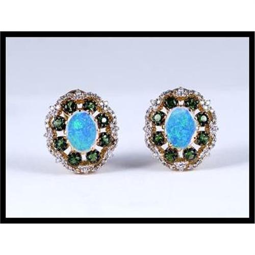 This pair of opal earrings is captivating and colorful. Made of 18K yellow gold, these earrings consist of 2 oval cut opals weighing 1.47 carats surrounded by 16 round cut green garnets weighing .77 carats and 96 full cut diamonds weighing .50 carats TW. The earrings measure 18 millimeters (11/16 inches) x 16 millimeters (5/8 inches).