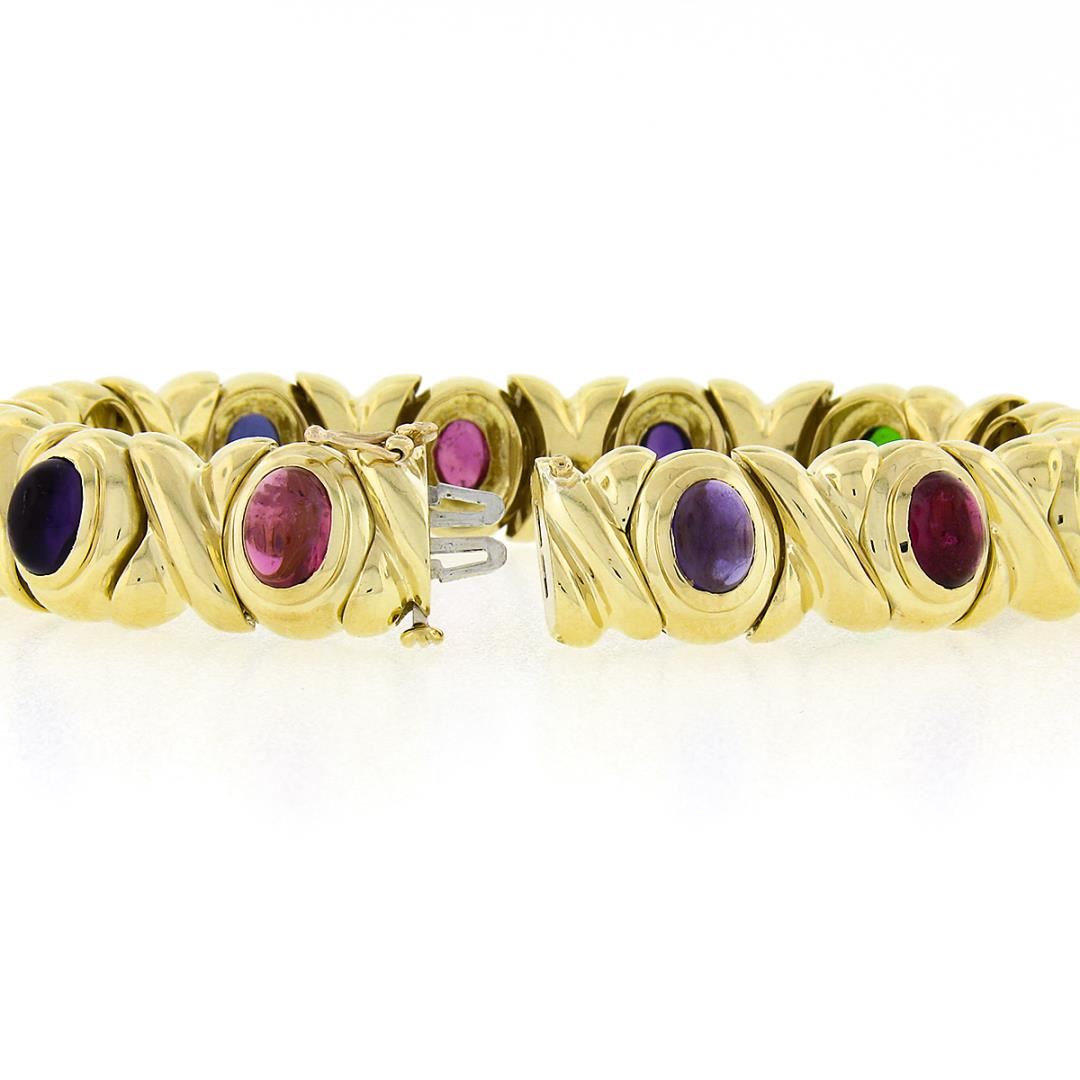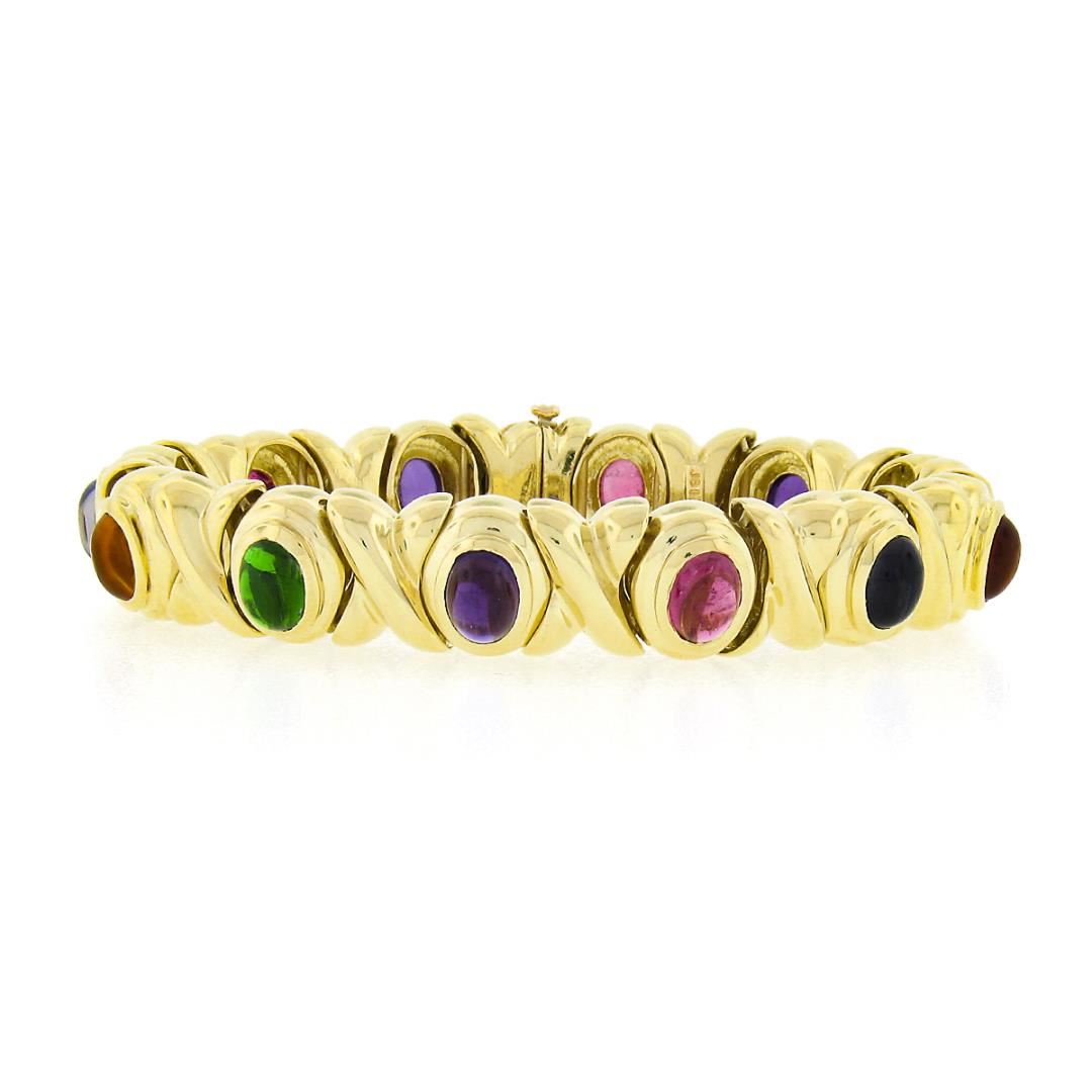 A solid 18k yellow gold XO link bracelet, with 12 oval cabochon cut natural amethyst, tourmaline, Iolite, citrine, & tsavorite (7.6x5.6mm each). It weighs a total of 65.69 grams, measures 13mm wide, and measures 6.75 inches in length.