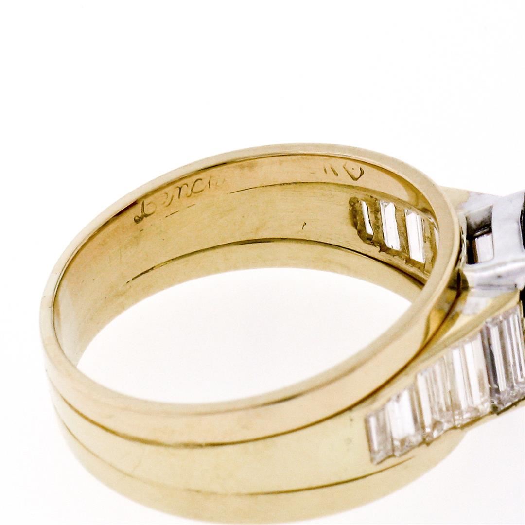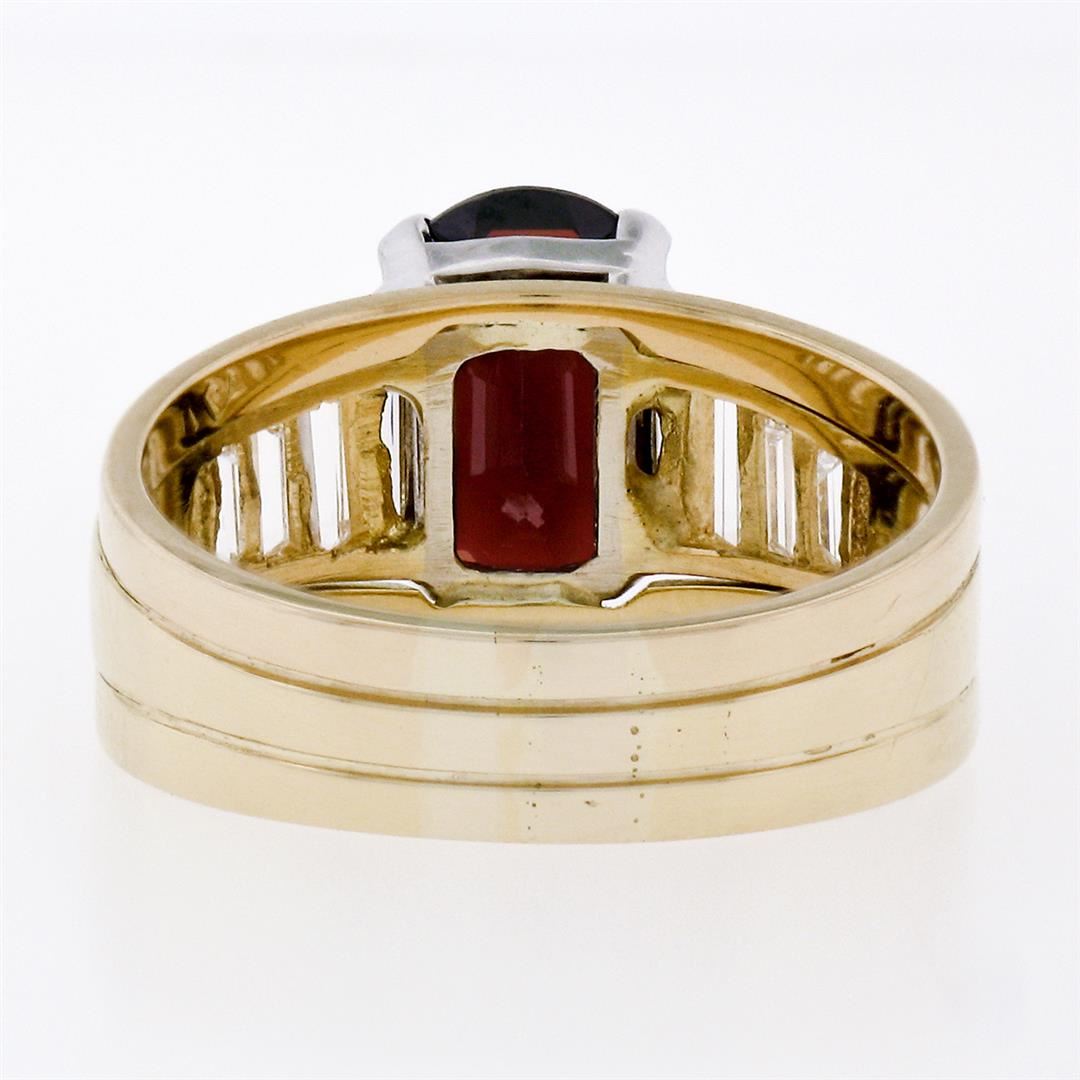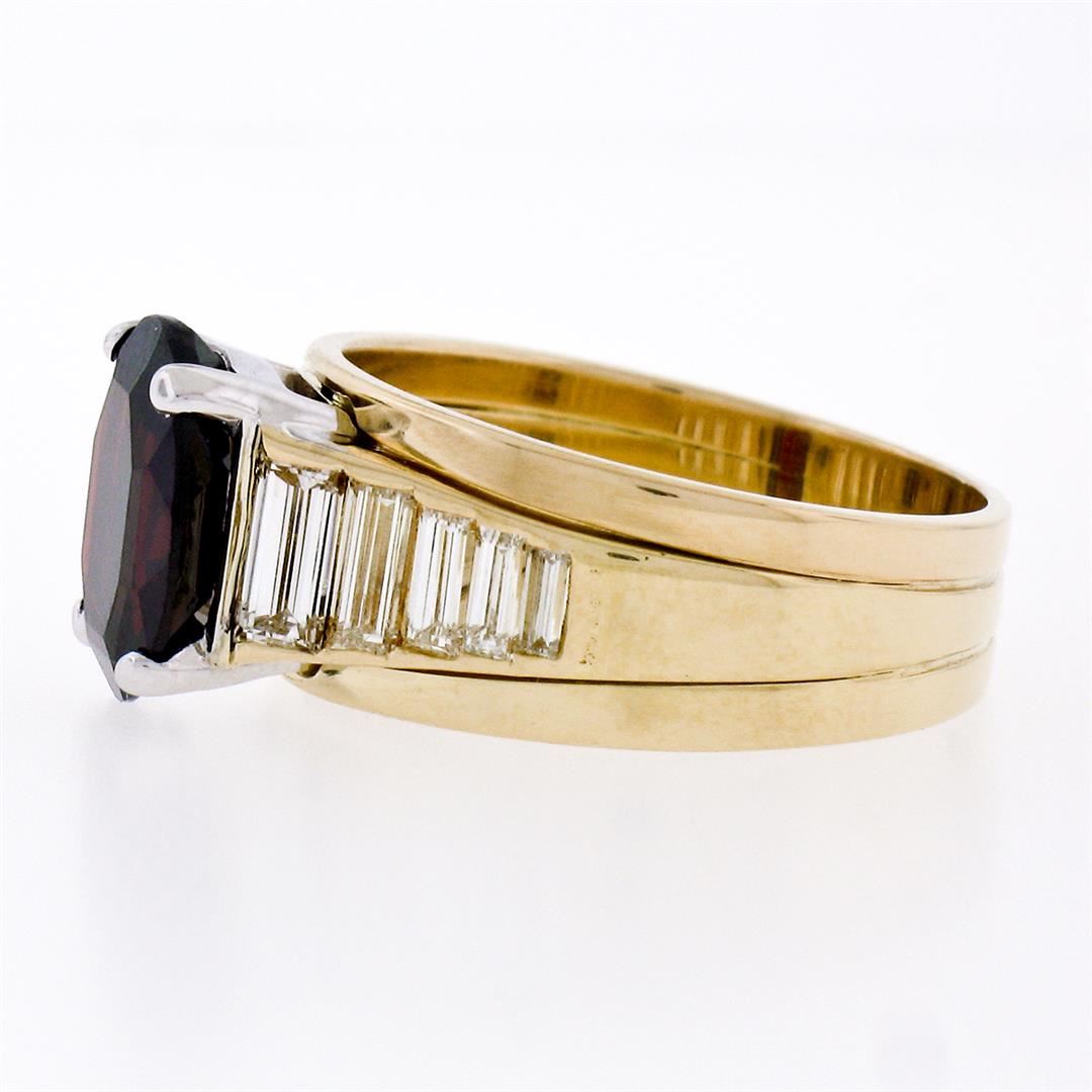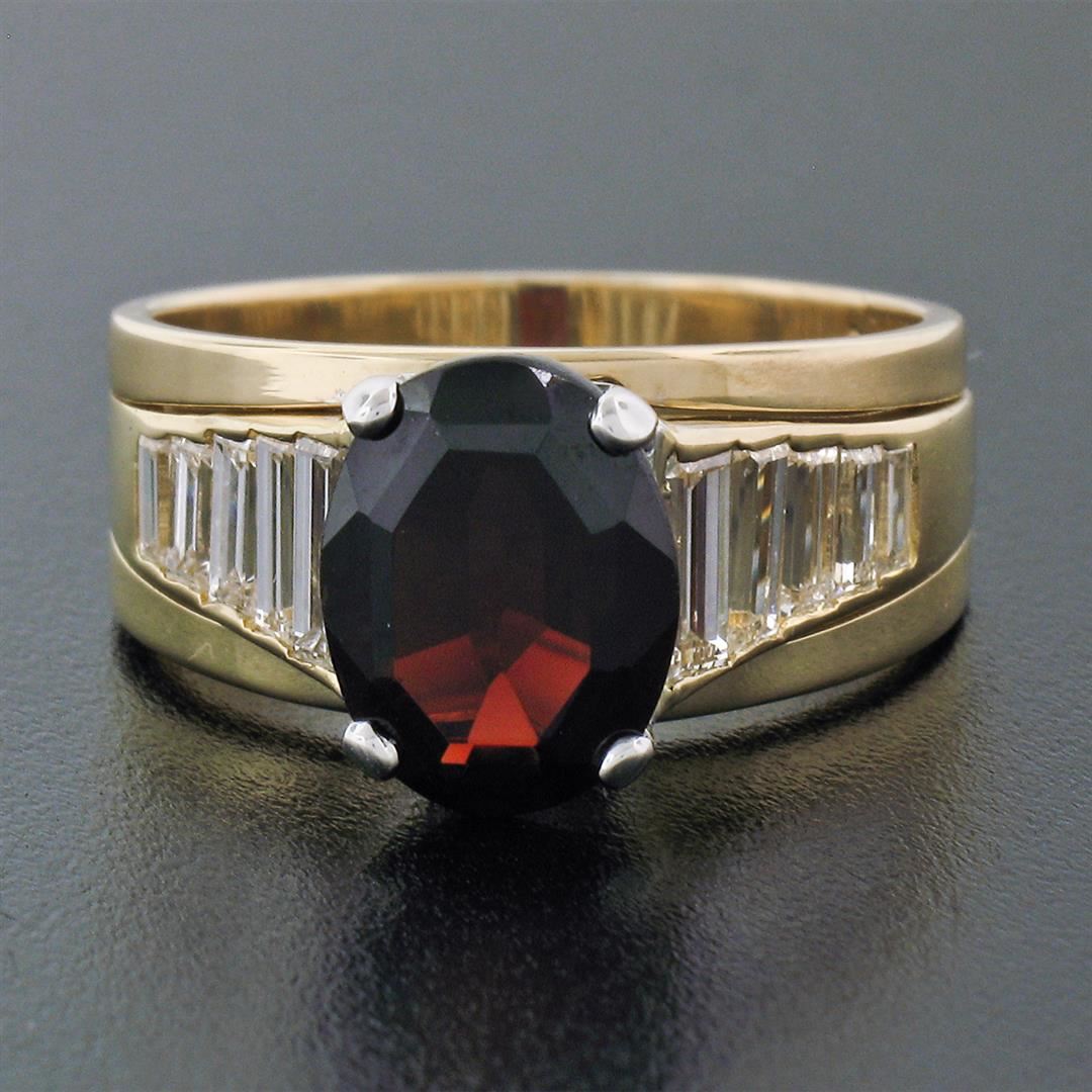 An estate solid 18k yellow gold solitaire ring, featuring 1 oval cut natural garnet (10.0x7.60mm), accented with 10 bagutte cut natural diamonds (G/H- VVS1/VVS2; 1.18ctw). The ring is size 6.5, weighs a total of 6.27 grams, and measures 8.35mm wide.