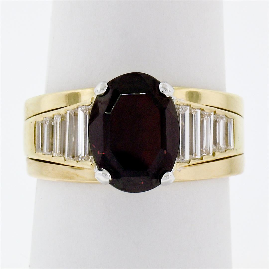 An estate solid 18k yellow gold solitaire ring, featuring 1 oval cut natural garnet (10.0x7.60mm), accented with 10 bagutte cut natural diamonds (G/H- VVS1/VVS2; 1.18ctw). The ring is size 6.5, weighs a total of 6.27 grams, and measures 8.35mm wide.
