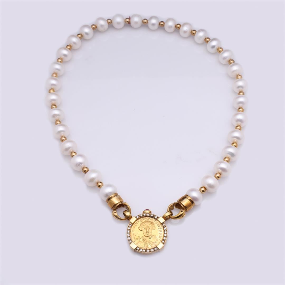 A choker necklace of 30 natural pearls, each spread with an 18k yellow gold bead at each end; 18k yellow gold adjustable claws support a handmade 18k yellow gold round frame of ancient form with claw set diamond bezel and mounted cabochon ruby of good col