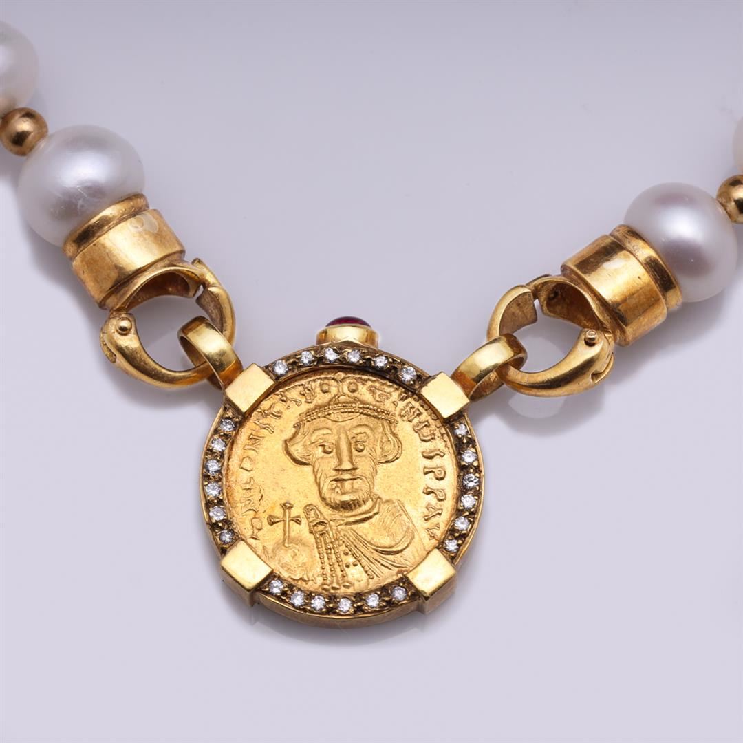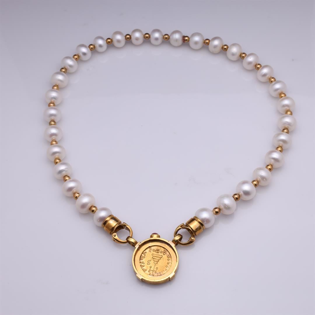 A choker necklace of 30 natural pearls, each spread with an 18k yellow gold bead at each end; 18k yellow gold adjustable claws support a handmade 18k yellow gold round frame of ancient form with claw set diamond bezel and mounted cabochon ruby of good col