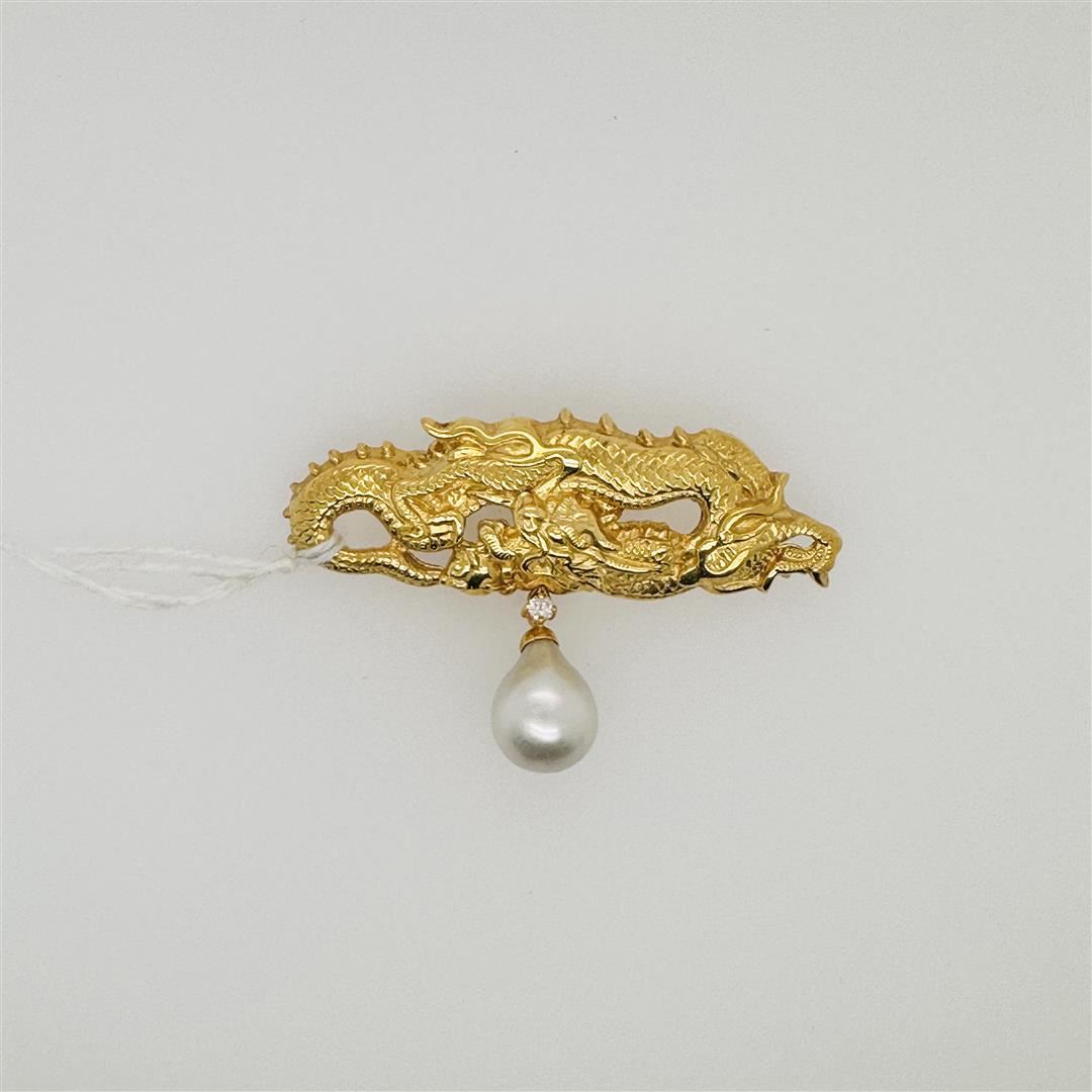 18k yellow gold brooch; cast from a Japanese menuki of dragon form set with single claw set white diamond atop a large pearl drop, designed by R. L. Kay; gross weight 15.3 g, 2 1/8" x 1 3/8" (approx.)
