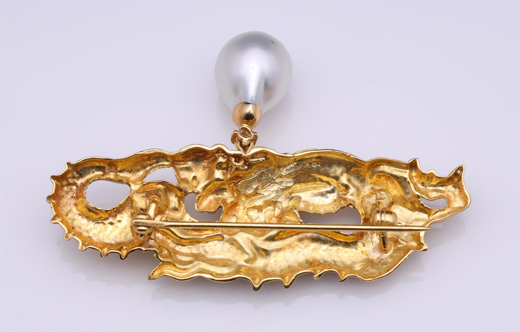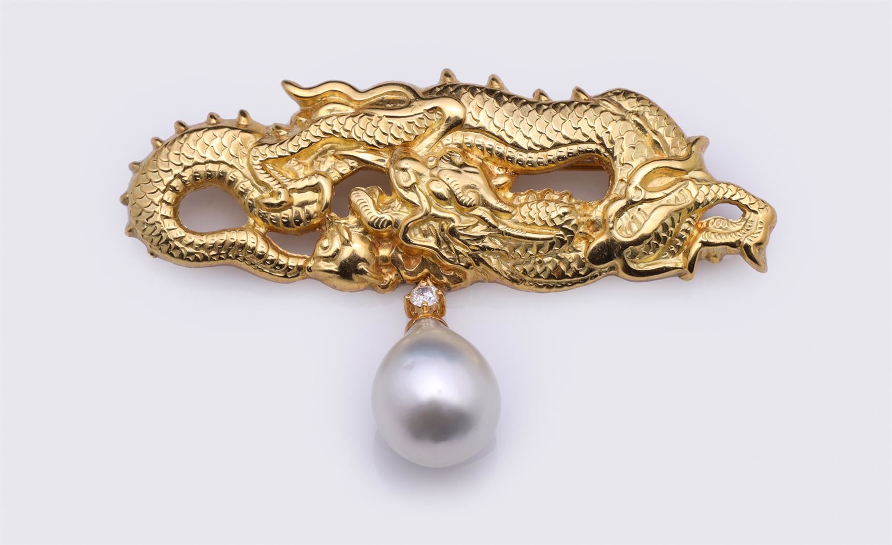 18K Yellow Gold Pearl & Diamond Brooch Cast from Japanese Menuki by R.L. Kay Total weight is 15.1 gm. Estimated retail value $2,800.