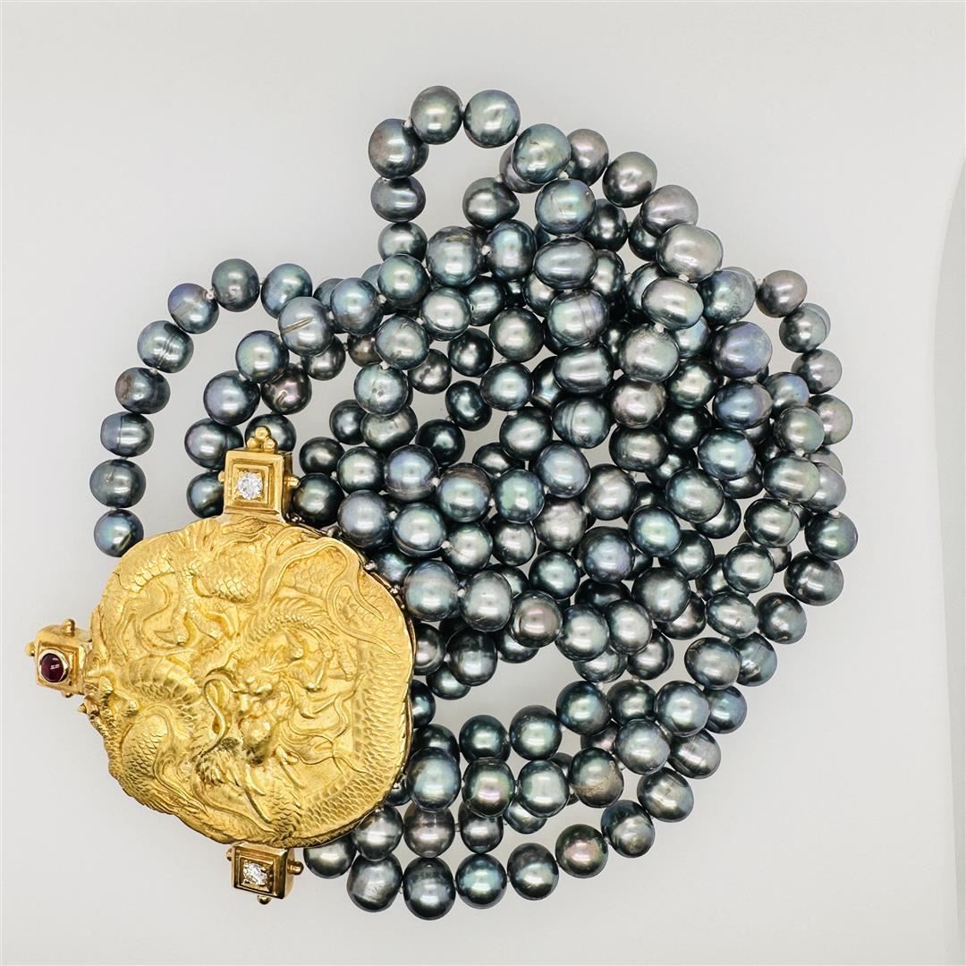 Large and heavy 18k yellow gold pendant with finely detailed dragon, ruby cabochon to base and flanked by two diamonds on four-strand black pearl choker with gold clasp gross weight 174.9 g, length 17" (approx.)