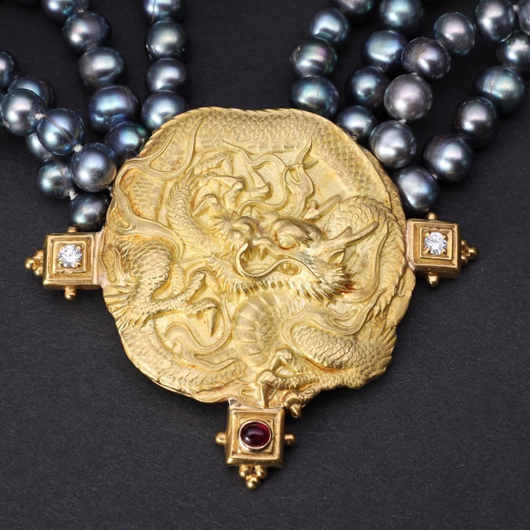 Large and heavy 18k yellow gold pendant with finely detailed dragon, ruby cabochon to base and flanked by two diamonds on four-strand black pearl choker with gold clasp gross weight 174.9 g, length 17" (approx.)