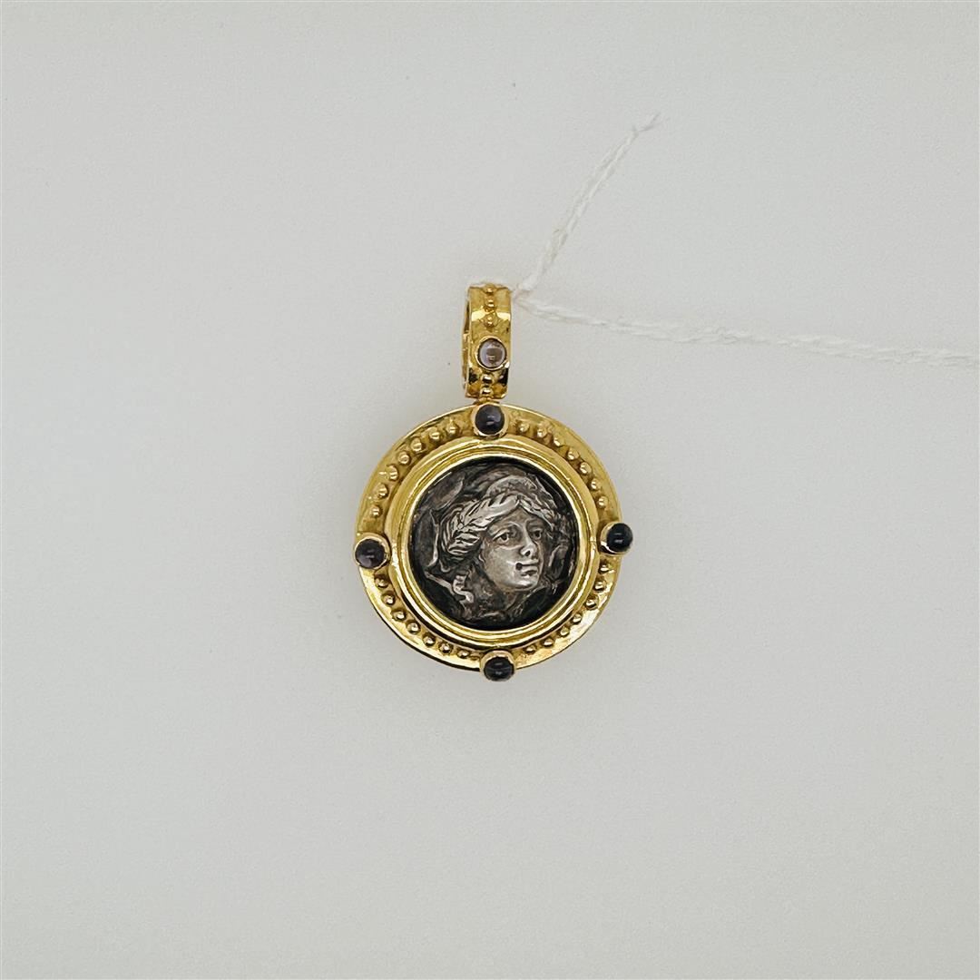 18k yellow gold pendant of circular form set with numerous blue iolite cabochons with gold beaded border and sterling silver insert of a face; gross weight 16.9 g; 1 5/8" x 1 1/8" (approx.)