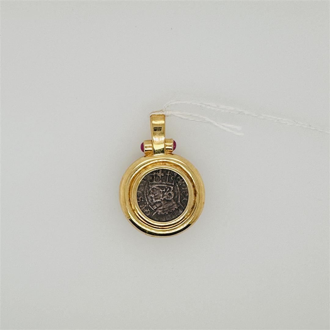 18k yellow gold pendant set with twin rubies flaking the bail and ancient silver Armenian coin to center, the coin from the reign of a Medieval Armenian Christian King who sent Knights to the Crusades, the pendant marked 18k; 11.7 g, 1 1/2" x 1" (approx.
