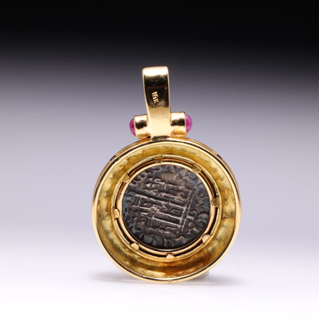 18k yellow gold pendant set with twin rubies flaking the bail and ancient silver Armenian coin to center, the coin from the reign of a Medieval Armenian Christian King who sent Knights to the Crusades, the pendant marked 18k; 11.7 g, 1 1/2" x 1" (approx.