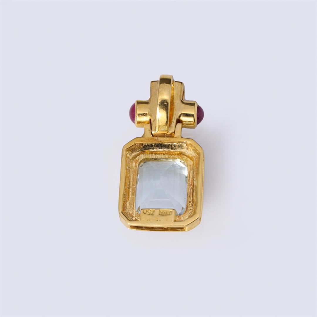18k yellow gold pendant with rubies and emerald cut topaz, pendant marked 750 with hallmark; gross weight 7.6 g, 1" x 1/2" (approx.)