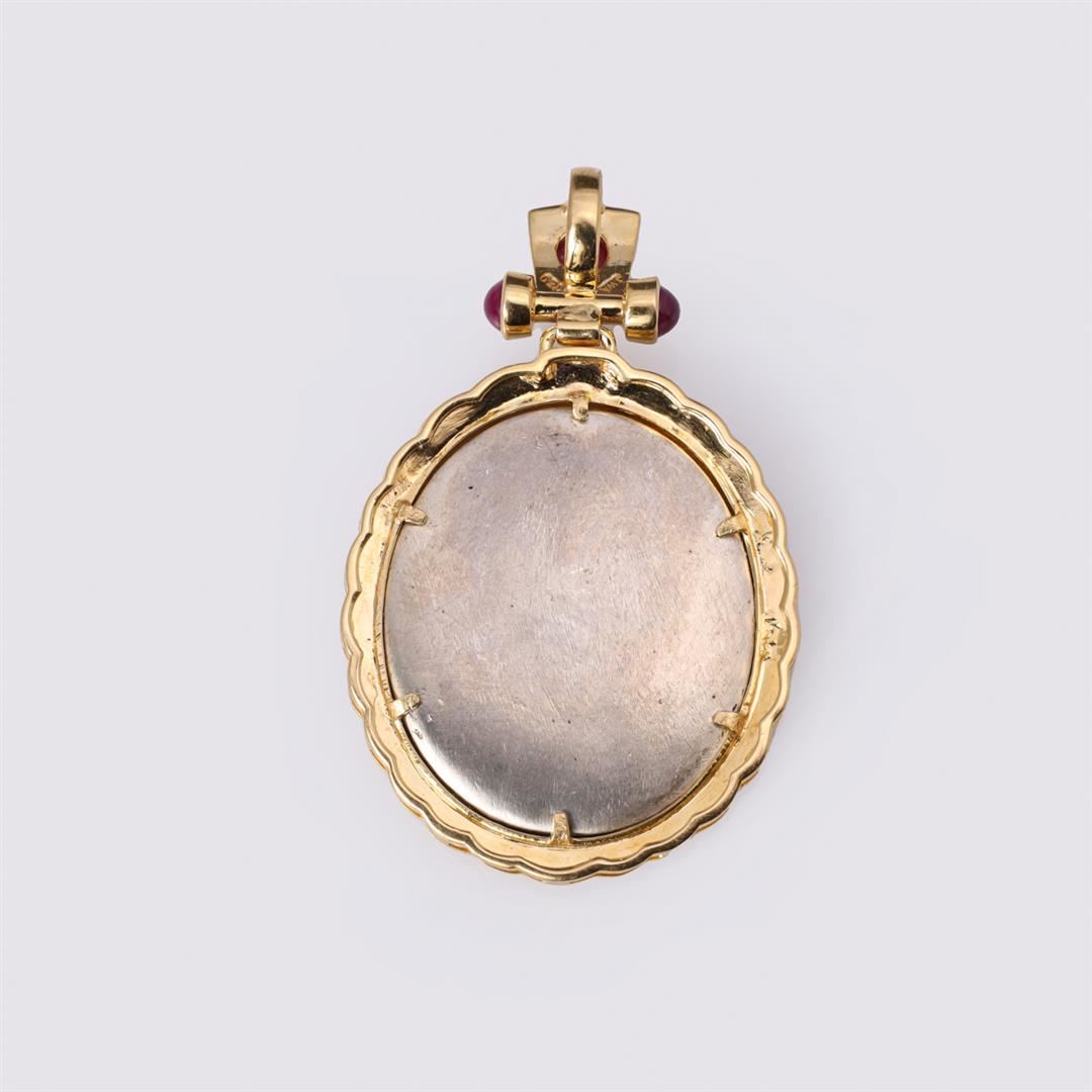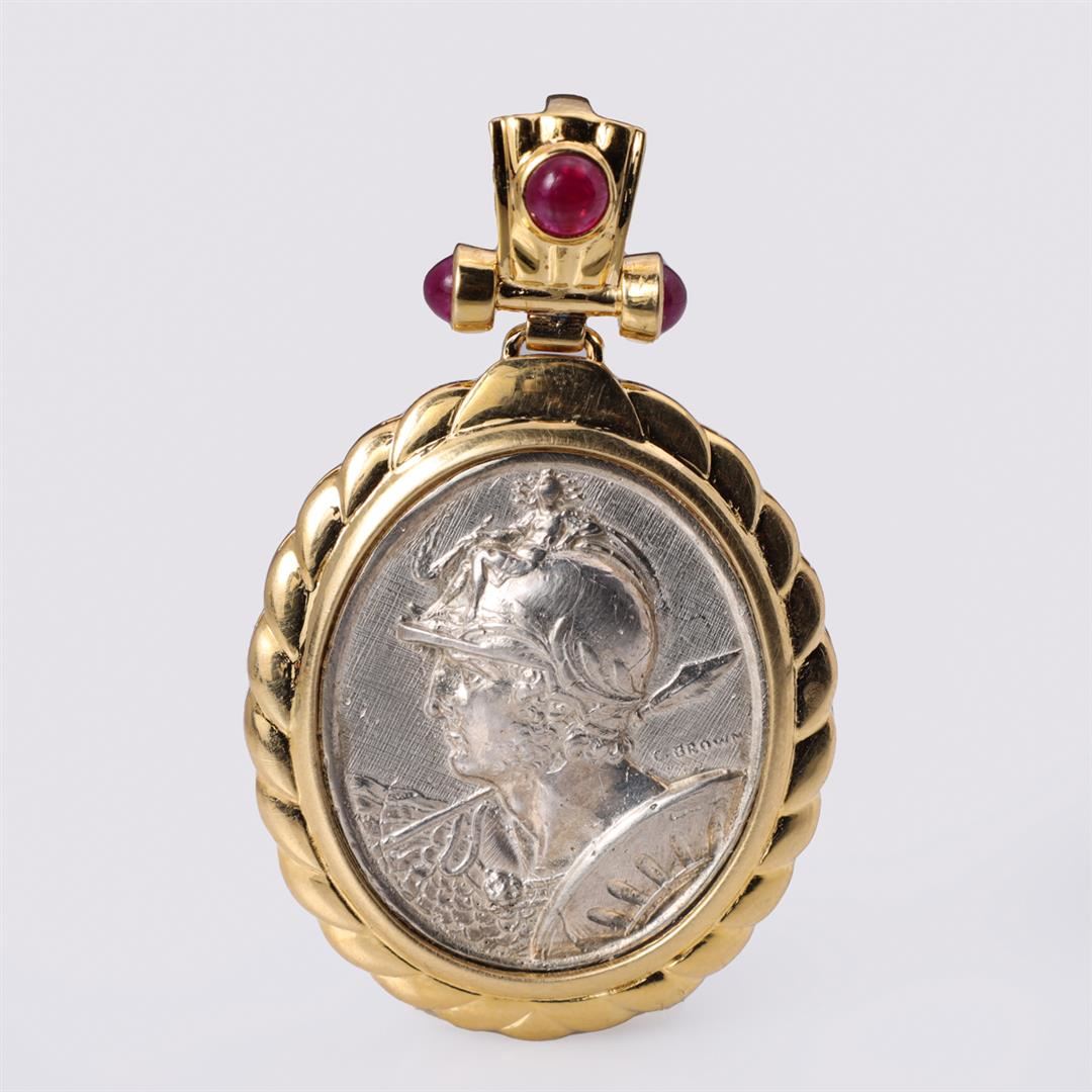 18k yellow gold pendant with rubies and vintage silver medallion, marked 750 with hallmark; gross weight 20.9 g, 2" x 1 1/4" (approx.)