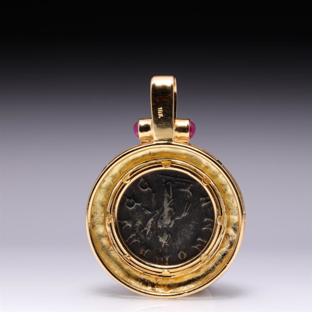 18k yellow gold pendant, the bail flanked with two ruby cabochons, center mounted Imperial Roman coin with bust of Philip as Caesar, the pendant marked 18k; 14.8 g, 1 5/8" x 1 1/8" (approx.)