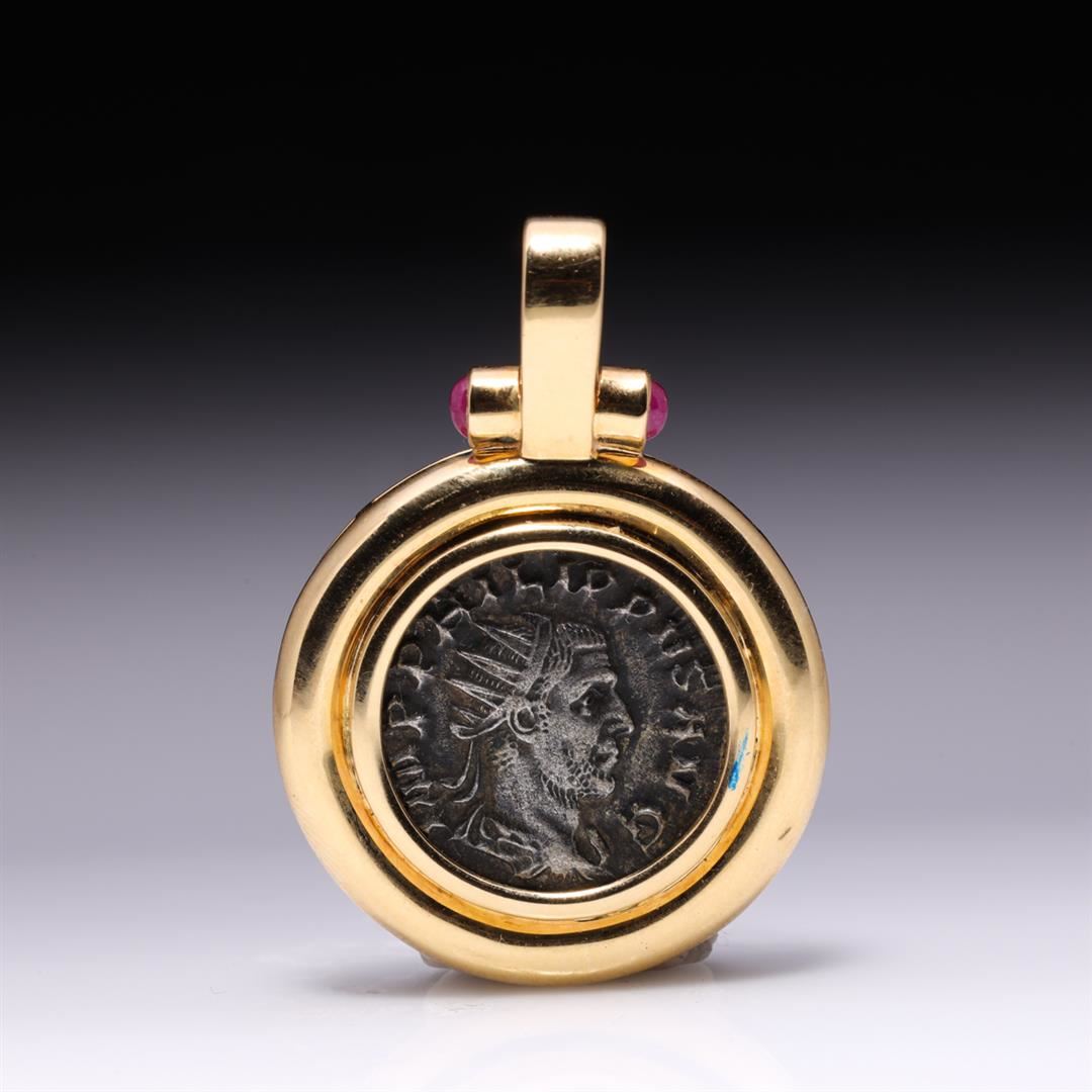 18K Yellow Gold Pendant with Rubies and Imperial Roman Coin containing two rubies weighing approximately 0.20 cts. Total weight is 14.6 gm. Estimated retail value $2,800.