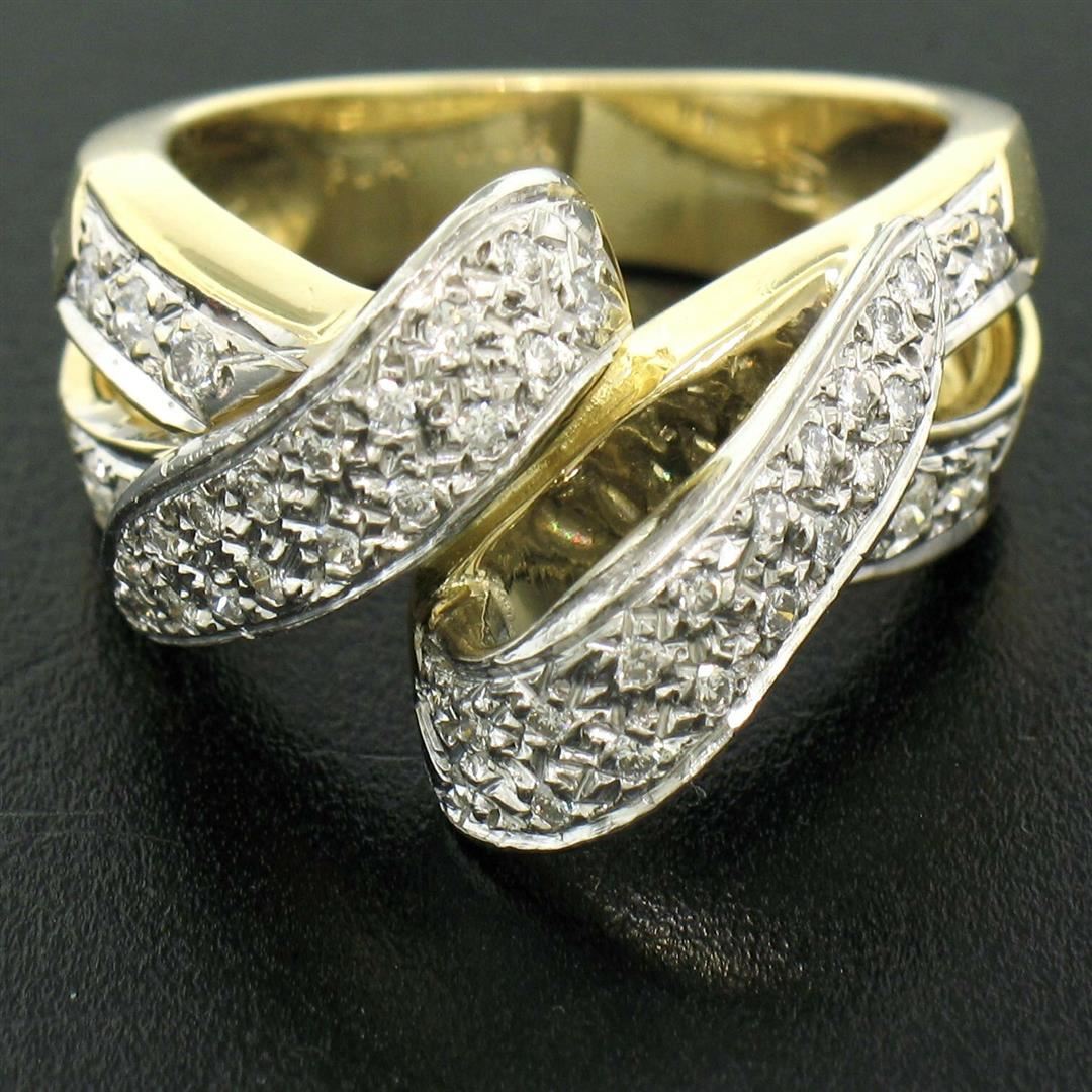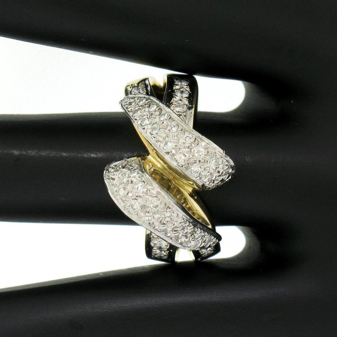 One 18K Yellow Gold & Platinum .46ctw Pavé Set Diamond Open Swirl Cocktail Ring Sz 7. Item Details: Material: Solid 18K Yellow Gold and Solid .950 Platinum, Weight: 14.36 Grams, Stone(s): (46) Natural Genuine Diamonds - Round Brilliant Cut - Pavé Set - VS1 Clarity - G Color, Total Carat Weight: 0.46 (approx.), Ring Size: 7.0 , Ring Width: 15.0mm, Ring Height: 9.13mm rise off the finger, Condition: Like New!