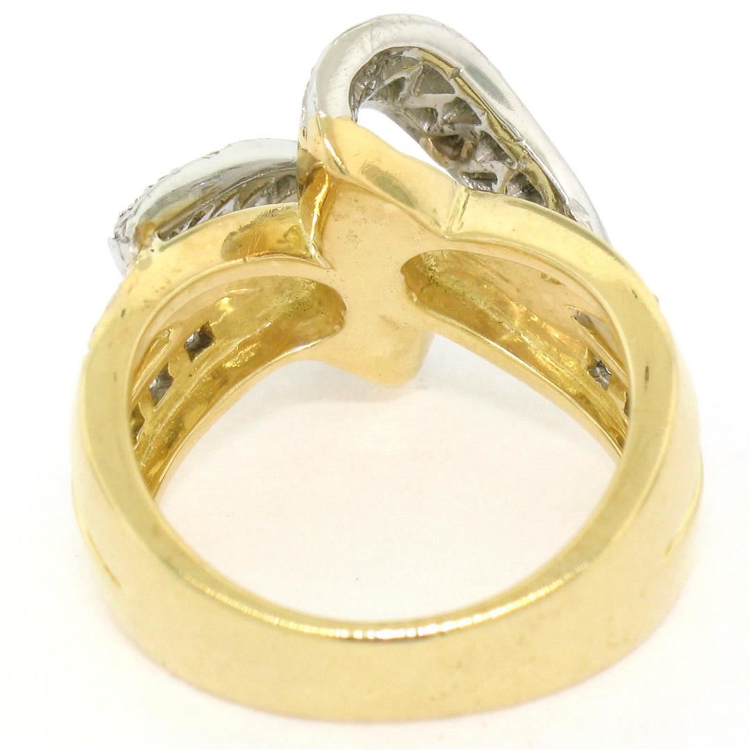 18K Yellow Gold & Platinum .46ctw Pave Set Diamond Open Swirl Cocktail Ring Sz 7. Please see photos and description for all available information. An estate solid 18k yellow gold and platinum swirl cocktail ring, with 46 round brilliant cut natural diamonds (G- VS1; 0.46ctw). The ring is size 7.0, weighs a total of 14.36 grams, and measures 15.0mm wide.