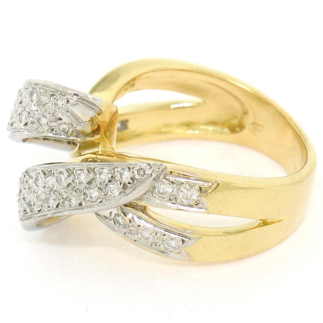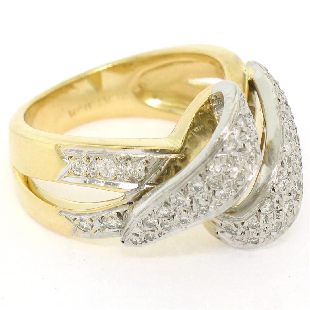 18K Yellow Gold & Platinum .46ctw Pave Set Diamond Open Swirl Cocktail Ring Sz 7. Please see photos and description for all available information. An estate solid 18k yellow gold and platinum swirl cocktail ring, with 46 round brilliant cut natural diamonds (G- VS1; 0.46ctw). The ring is size 7.0, weighs a total of 14.36 grams, and measures 15.0mm wide.