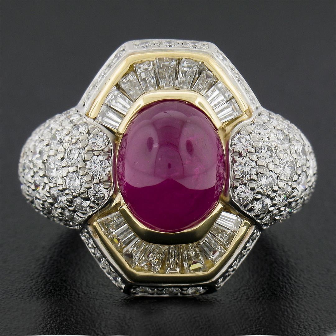 A solid 18k yellow gold & platinum cocktail ring, with 1 GIA graded oval cabochon cut natural ruby (5.81ct), and numerous of baguette & round cut natural diamonds (F-H - VS1/VS2 ; 2.70ctw). The ring is size 7.0, weighs a total of 22.14 grams, and measures 20.8mm wide. Comes with all original relevant certifications.