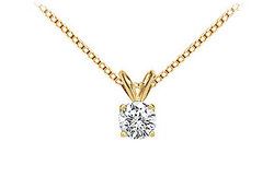 A round diamond is delicately suspended in rich 18K yellow gold 4-prong mounting. This diamond solitaire pendant has a total weight (TDW) of 0.33 ct and comes with a standard 16 14K yellow gold chain.