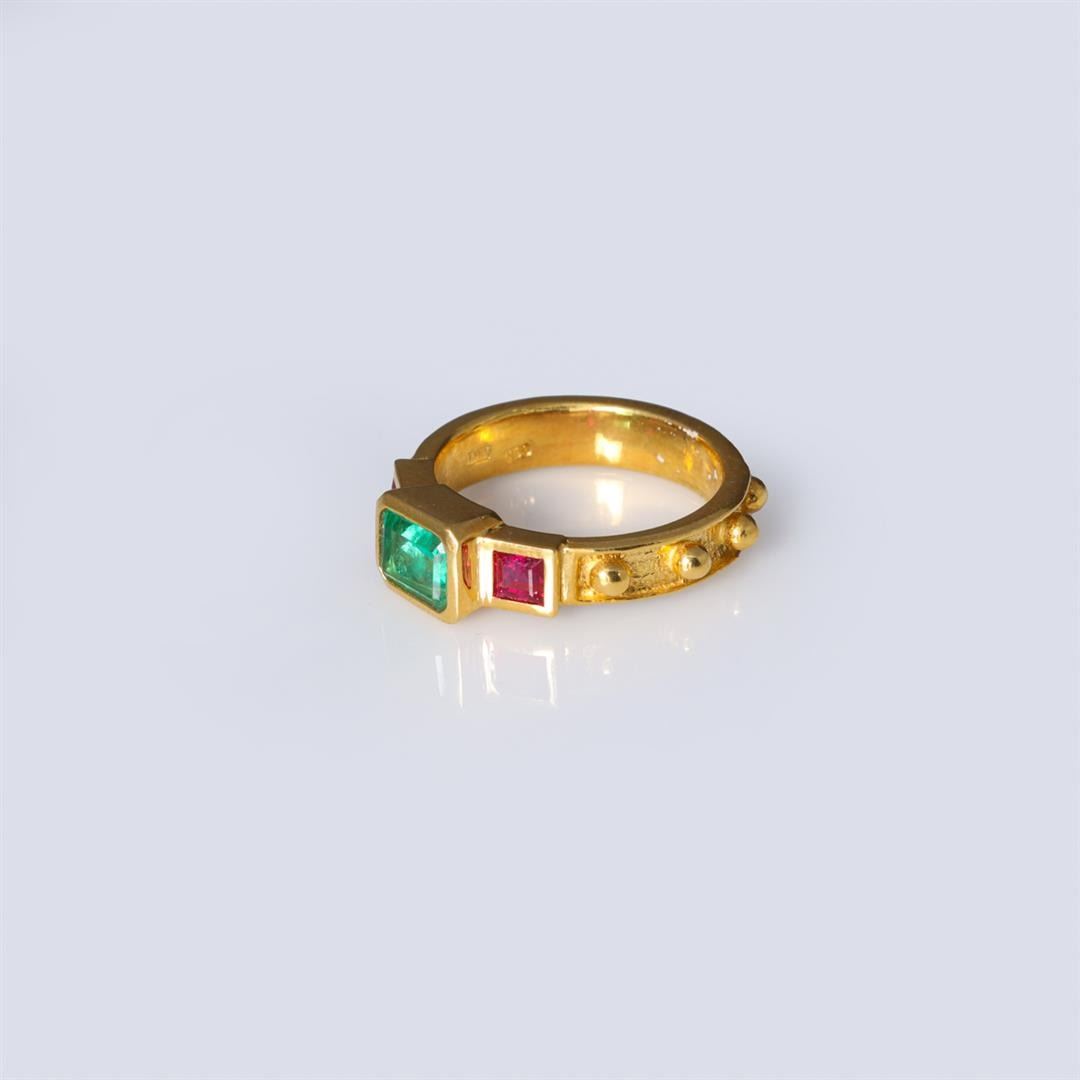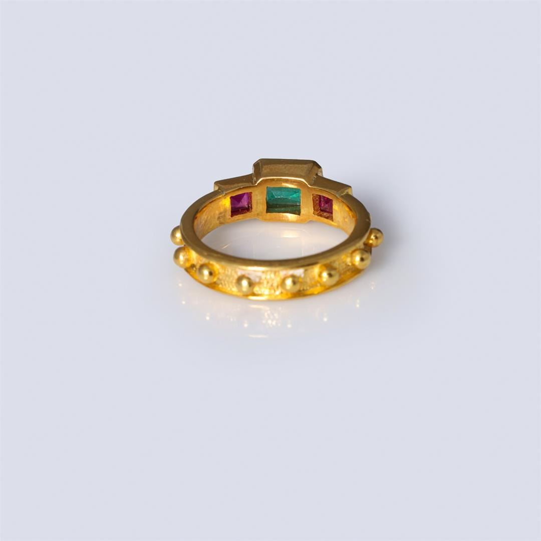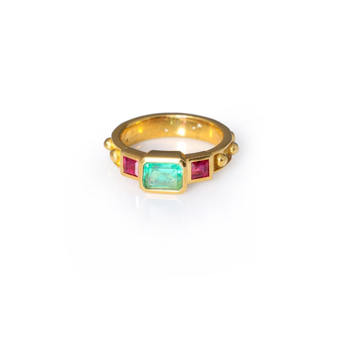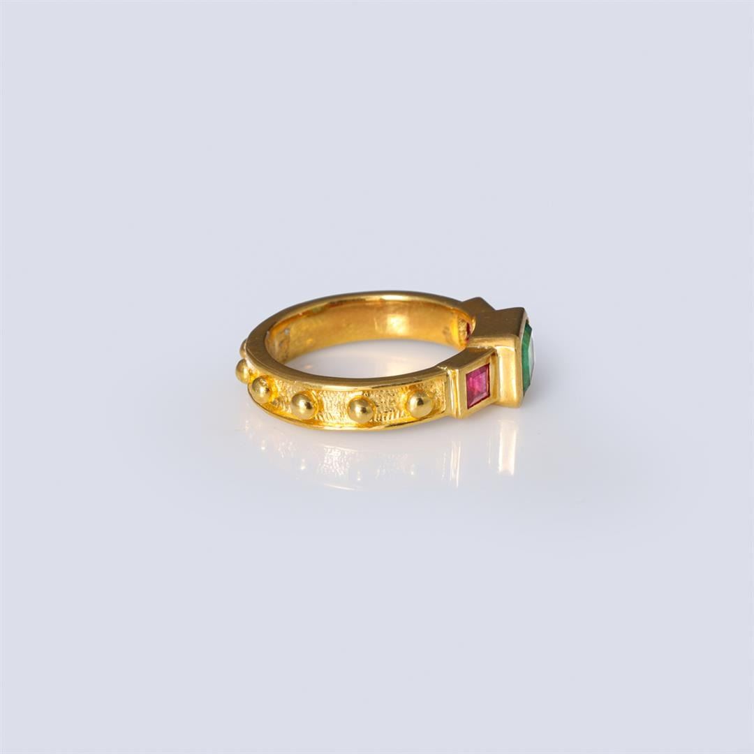 18k yellow gold designer ring by Carlo Rici; with a fine bezel set faceted Columbian emerald of good color with princess cut rubies to each shoulder, the shank decorated overall with round gold beads within a linier border, the interior of the ring with h