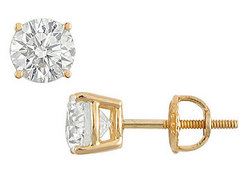 A pair of perfectly matched round diamonds are set in a rich 18K yellow gold 4-prong mounting. These diamond stud earrings have a total weight (TDW) of 2.00 ct and are available in either screw-back or push-back. The TDW includes the combined weight of both diamonds.