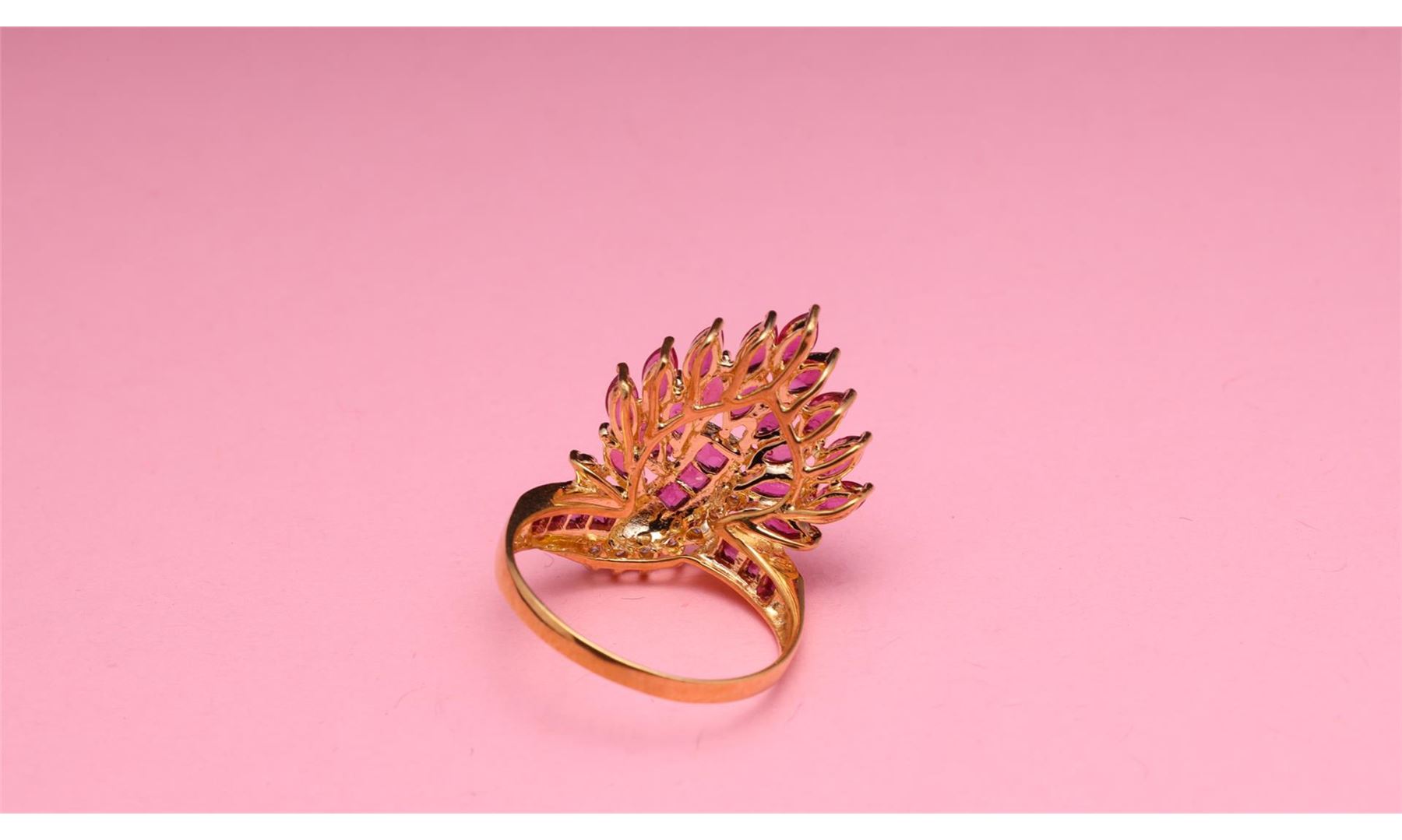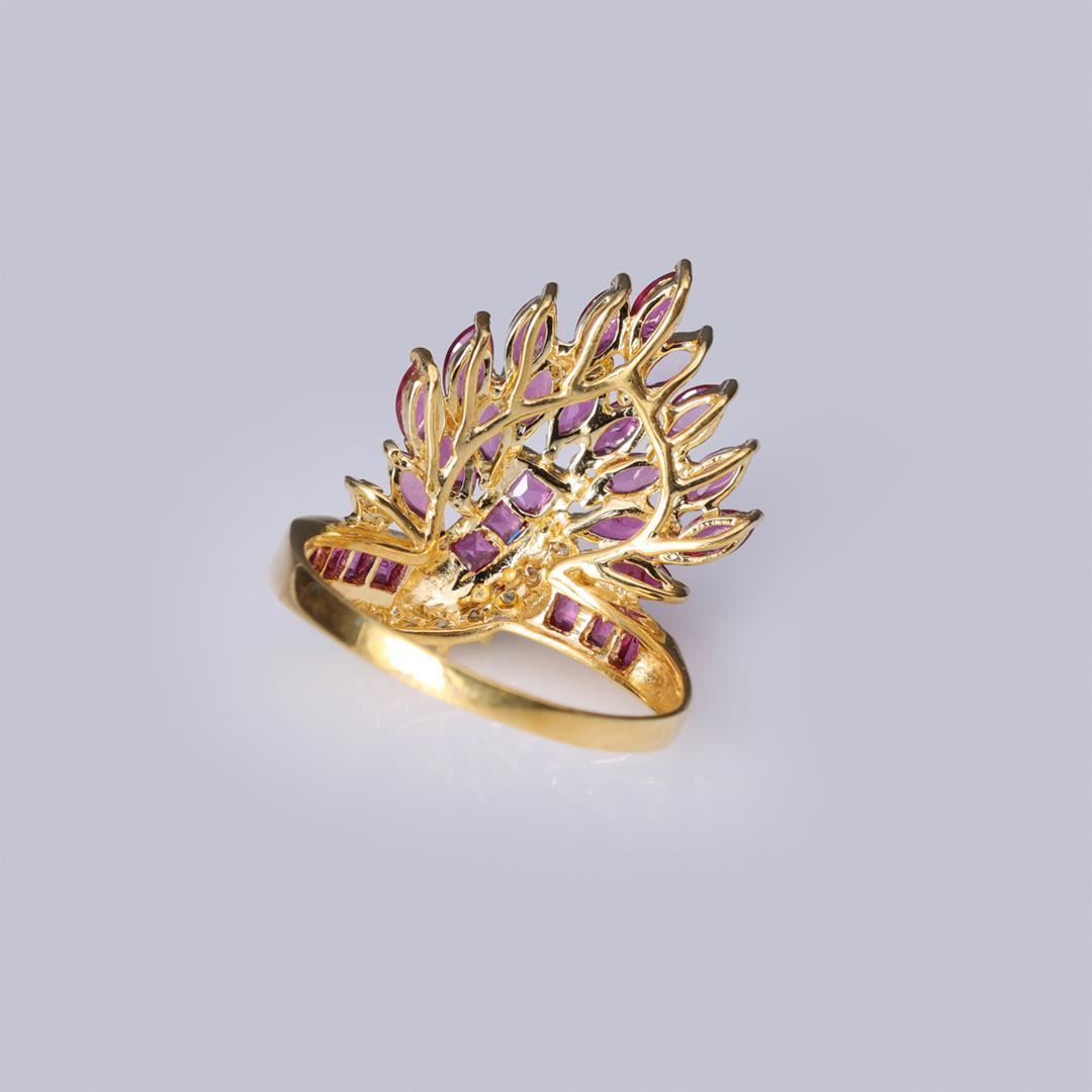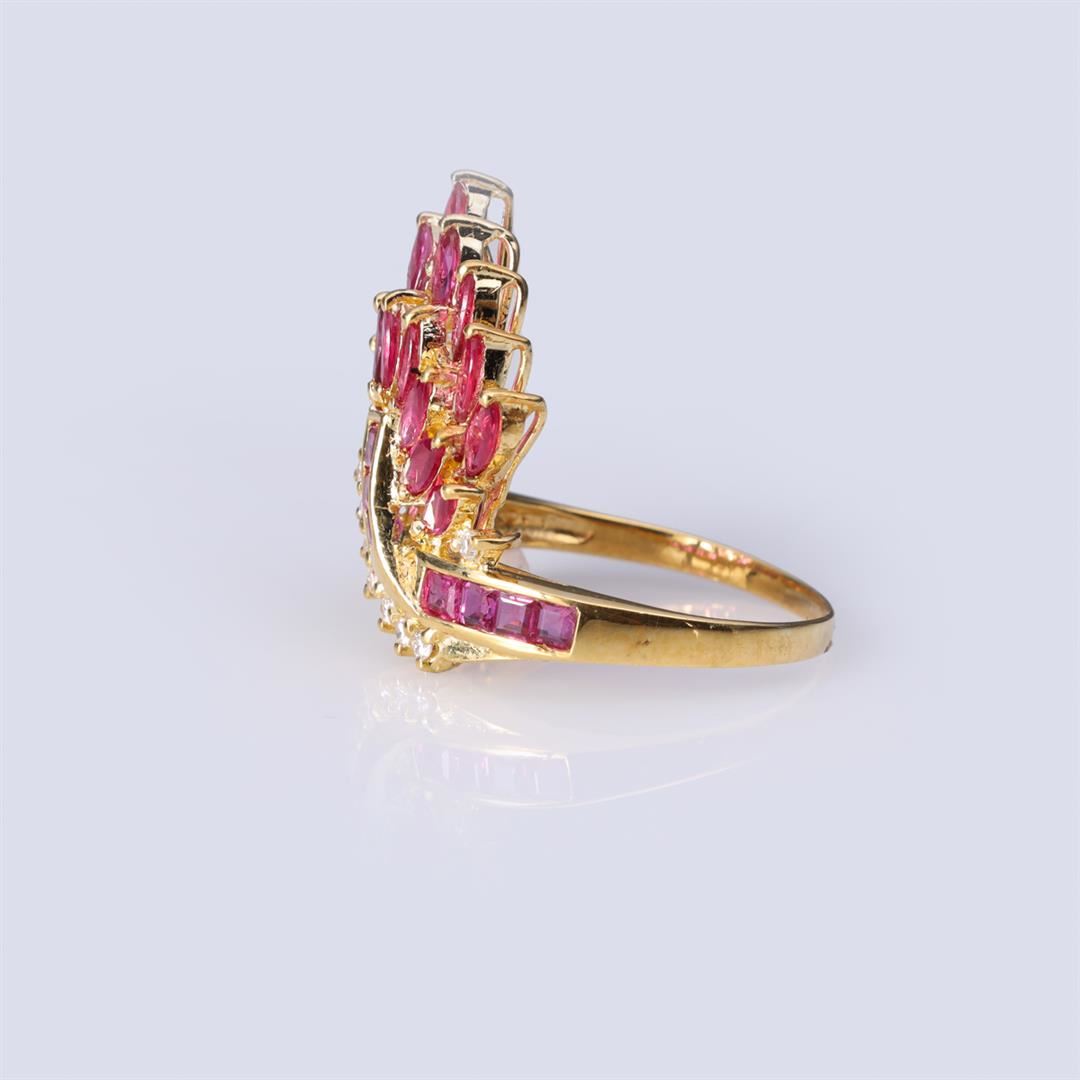 18K Yellow Gold Ruby & Diamond Cocktail Ring containing rubies weighing approximately 2.0 cts. Eight round cut brilliant diamonds weighing approximately 0.15 cts. Total weight of ring is 5 gm. Estimated retail value $1,980.